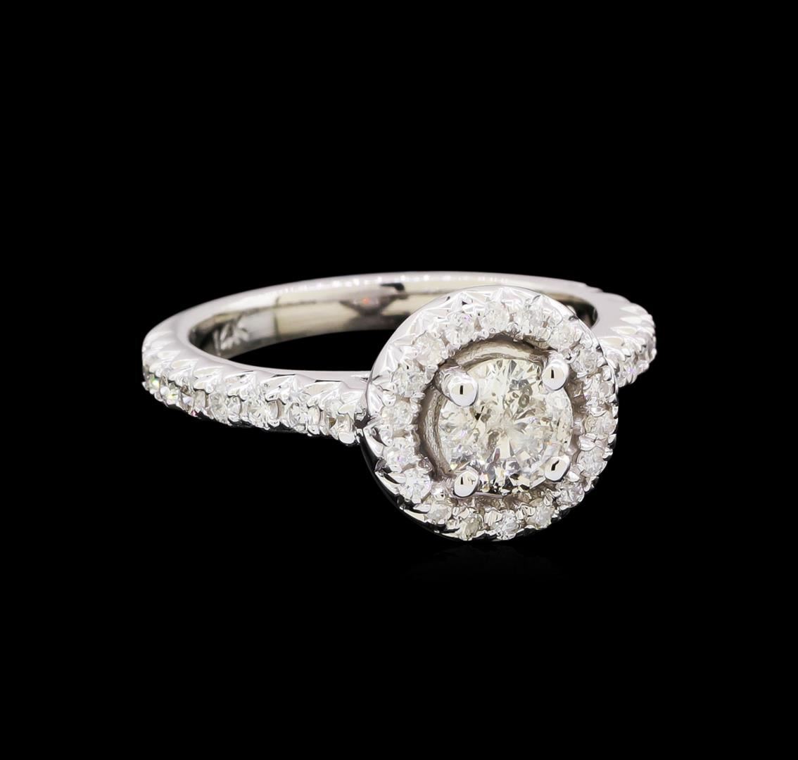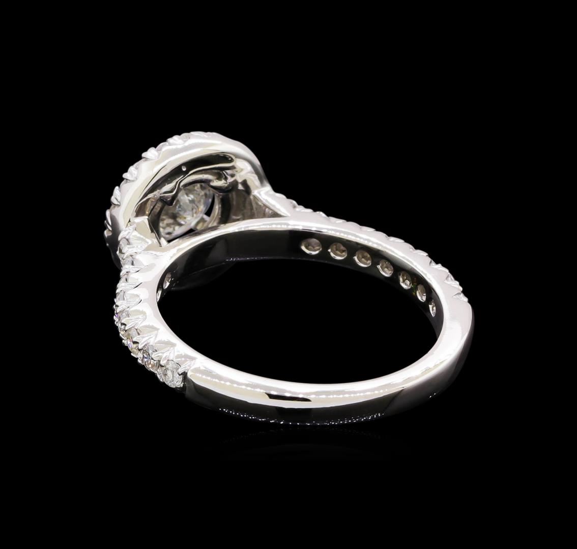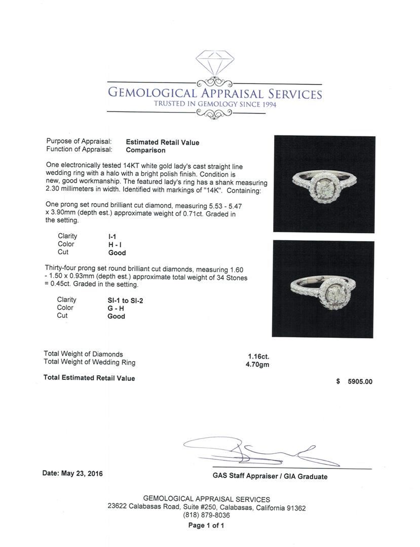 One electronically tested 14KT white gold lady's cast straight line wedding ring with a halo with a bright polish finish. The featured lady's ring has a shank measuring 2.30 millimeters in width. Identified with markings of "14K". Condition is new, good workmanship. Containing: One prong set round brilliant cut diamond, measuring 5.53 - 5.47 x 3.90mm (depth est.) approximate weight of 0.71ct. Graded in the setting. Clarity: I-1. Color: H - I. Cut Good Thirty-Four prong set round brilliant cut diamonds, measuring 1.60 - 1.50 x 0.93mm (depth est.) approximate total weight of 34 Stones = 0.45ct. Graded in the setting. Clarity: SI-1 to SI-2. Color: G - Good. Total Weight of Diamonds 1.16ct. Total Weight of Wedding Ring 4.70gm. GAS Appraised at $5,905.00.