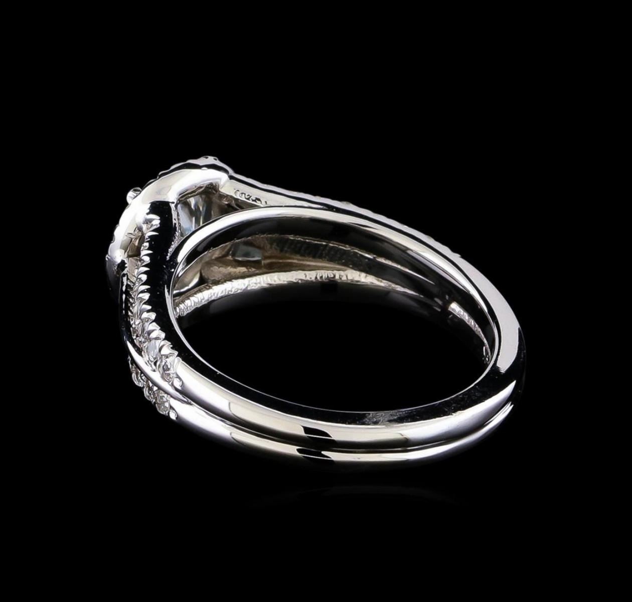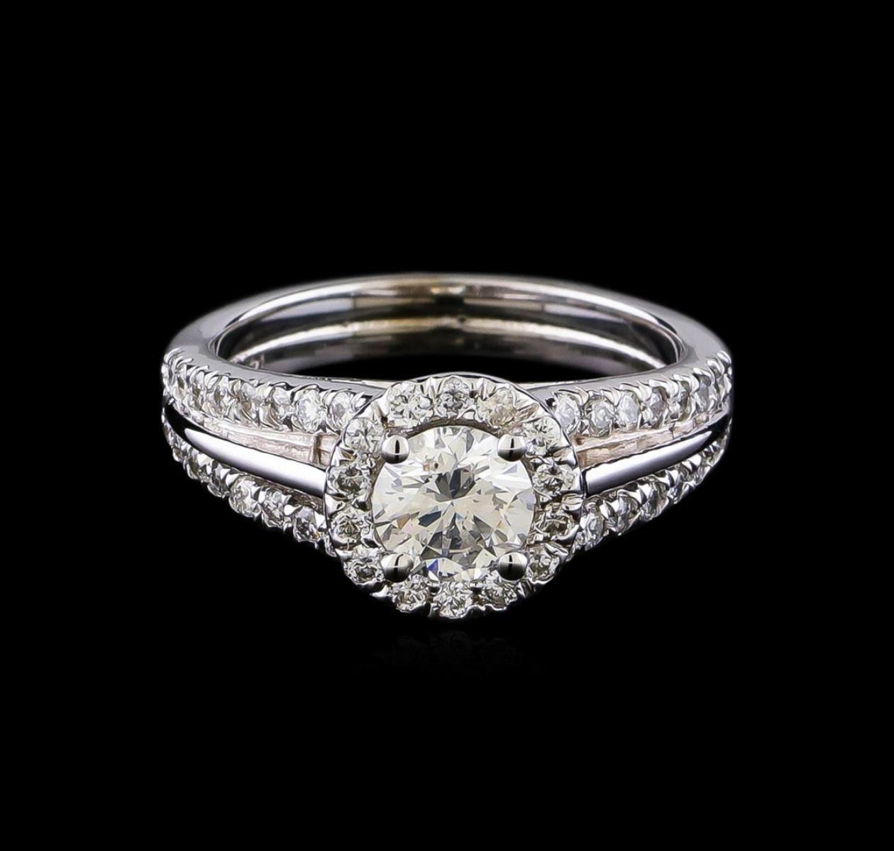 One electronically tested 14KT white gold lady's cast wedding ring with a split shank cathedral halo with a bright polish finish. The featured lady's ring has a double shank measuring 3.0 millimeters in width. Identified with markings of "14K". Condition is new, good workmanship. Containing: One prong set round brilliant cut diamond, measuring 5.48 - 5.48 x 3.28mm (depth est.) approximate weight of 0.62ct. Graded in the setting. Clarity: SI-2. Color: H - I. Cut Good Forty-Six prong set round brilliant cut diamonds, measuring 1.50 - 1.40 x 0.90mm (depth est.) approximate total weight of 46 Stones = 0.54ct. Graded in the setting. Clarity: SI-1 to SI-2. Color: G - Good. Total Weight of Diamonds 1.16ct. Total Weight of Ring 4.90gm. GAS Appraised at $6,575.00.