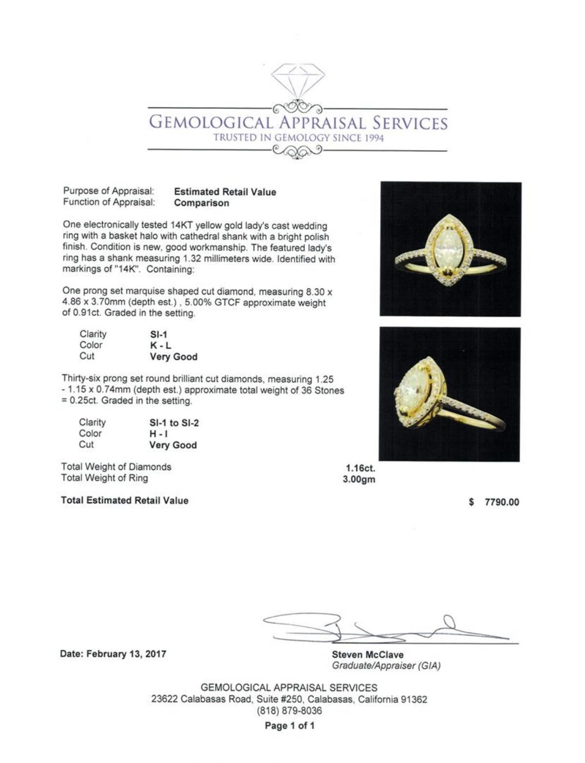 One electronically tested 14KT yellow gold lady's cast wedding ring with a basket halo with cathedral shank with a bright polish finish. The featured lady's ring has a shank measuring 1.32 millimeters wide. Identified with markings of '14K'. Condition is new, good workmanship. Containing: One prong set marquise shaped cut diamond, measuring 8.30 x 4.86 x 3.70mm (depth est.) , 5.00.%. GTCF approximate weight of 0.91ct. Graded in the setting. Clarity SI-1. Color: K - L Cut Very Good Thirty-Six prong set round brilliant cut diamonds, measuring 1.25 - 1.15 x 0.74mm (depth est.) approximate total weight of 36 Stones = 0.25ct. Graded in the setting. Clarity SI-1 to SI-2. Color: H - I Cut Very Good. Total Weight of Diamonds 1.16ct.. Total Weight of Ring 3.00gm. GAS Appraised at $7,790.00.