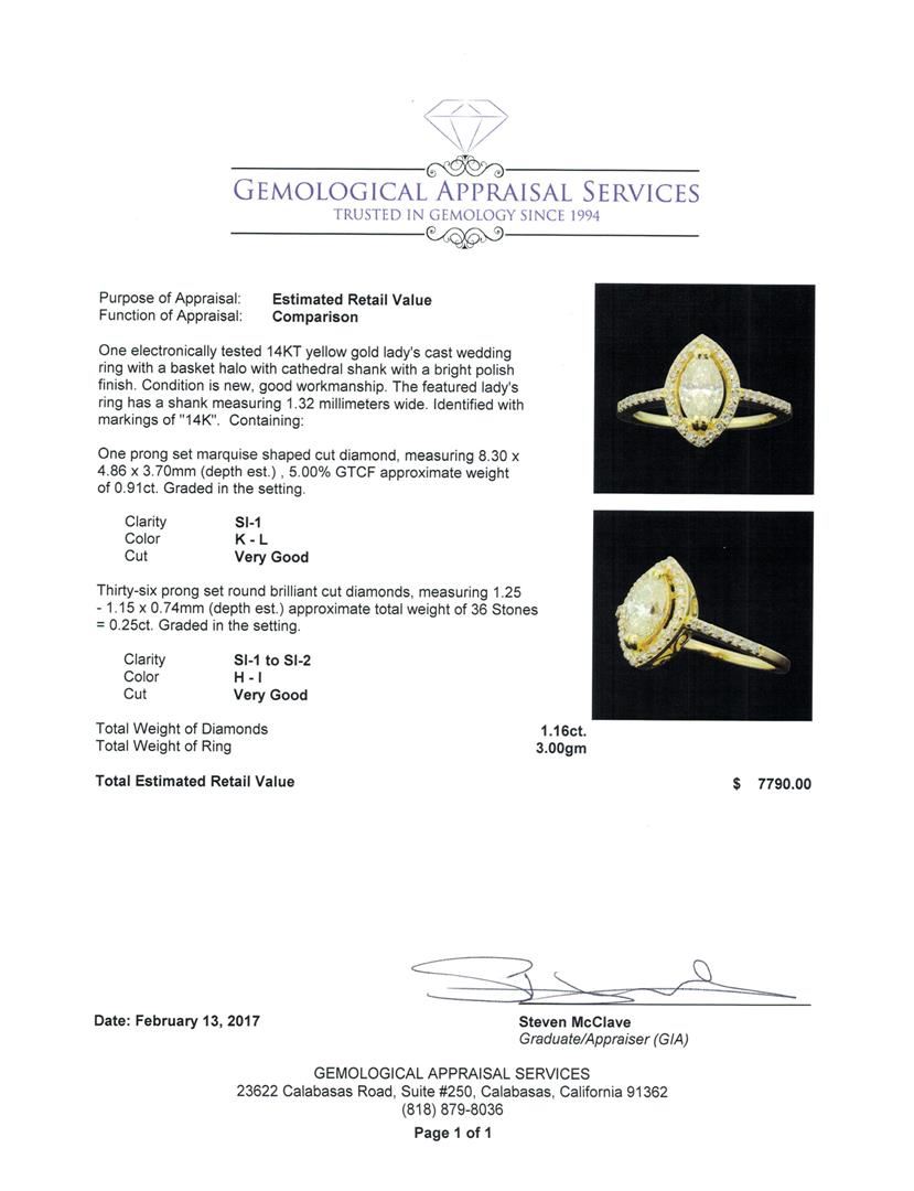 One electronically tested 14KT yellow gold lady's cast wedding ring with a basket halo with cathedral shank with a bright polish finish. The featured lady's ring has a shank measuring 1.32 millimeters wide. Identified with markings of '14K'. Condition is new, good workmanship. Containing: One prong set marquise shaped cut diamond, measuring 8.30 x 4.86 x 3.70mm (depth est.) , 5.00.%. GTCF approximate weight of 0.91ct. Graded in the setting. Clarity SI-1. Color: K - L Cut Very Good Thirty-Six prong set round brilliant cut diamonds, measuring 1.25 - 1.15 x 0.74mm (depth est.) approximate total weight of 36 Stones = 0.25ct. Graded in the setting. Clarity SI-1 to SI-2. Color: H - I Cut Very Good. Total Weight of Diamonds 1.16ct.. Total Weight of Ring 3.00gm. GAS Appraised.
