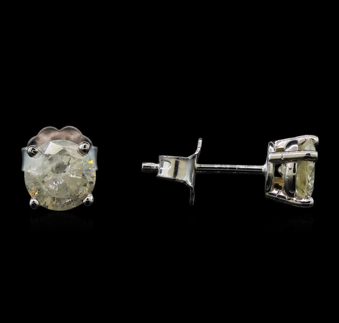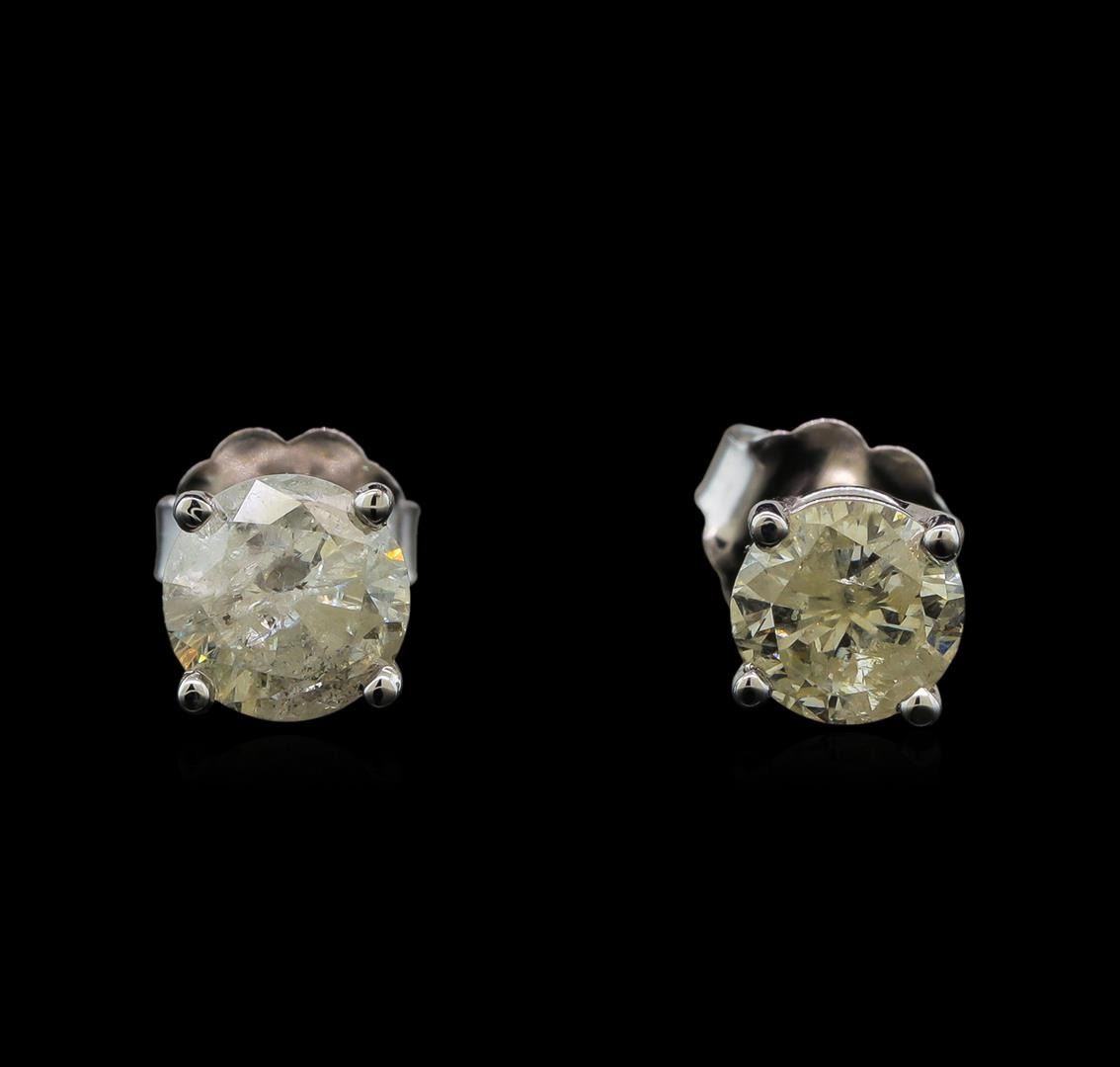One pair electronically tested 14KT white gold ladies cast diamond stud earrings with friction posts with a bright polish finish. Identified with markings of "14K". Condition is new. Containing: Two prong set round brilliant cut diamonds, measuring 5.40 - 5.40 x 3.26mm (depth est.) approximate total weight of 2 Stones = 1.16ct. Clarity: I-3 to I-3. Color: K, Cut is Good. Diamonds are graded in the mounting, unless otherwise stated. Total Weight of Diamonds 1.16ct. Total Weight of Stud Earrings 1.10 grams.