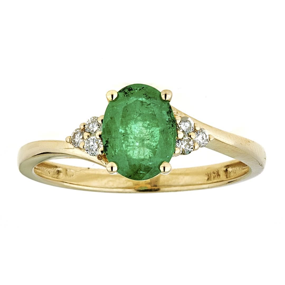 One Emerald and Diamond Ring featuring: 14KT Yellow Gold weighing a total of 2.08 grams, Emerald with a total weight of 2.08ct, and 6 Diamonds with a total weight of 0.11ctw.