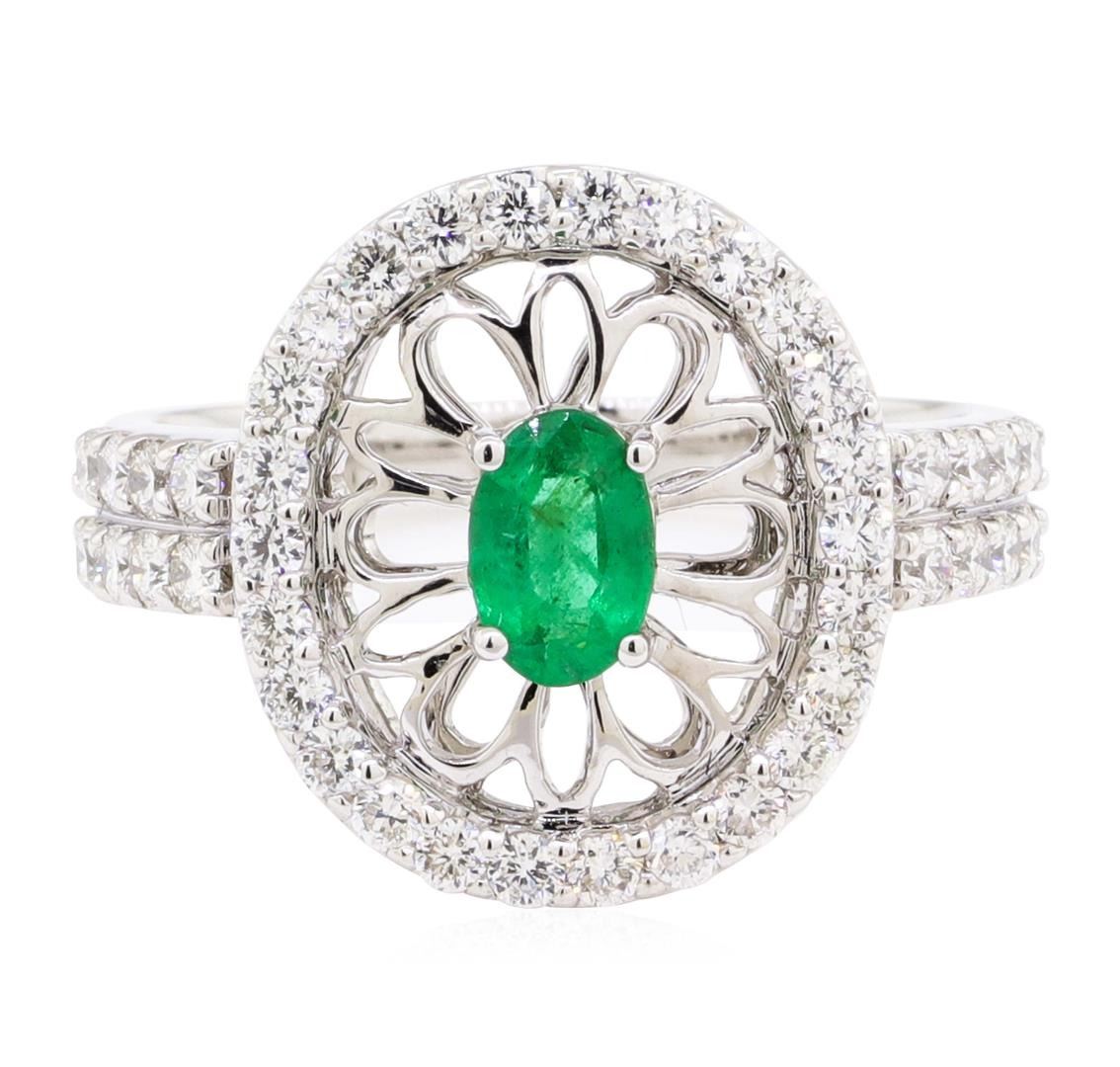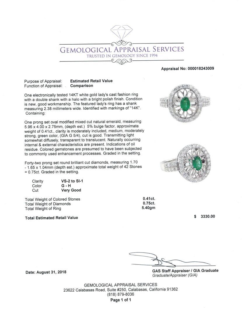 One electronically tested 14KT white gold lady's cast fashion ring with a double shank with a halo with a bright polish finish. The featured lady's ring has a shank measuring 2.38 millimeters wide. Identified with markings of '14K'. Condition is new, good workmanship. Containing: One prong set oval modified mixed cut natural emerald, measuring 5.96 x 4.00 x 2.75mm, (depth est.) 5%. bulge factor, approximate weight of 0.41ct., clarity is moderately included, medium, moderately strong, green color, (GIA G 5/4), cut is good. Transmitting light somewhat diffusely, transparent to translucent. Naturally occurring internal & external characteristics are present. Indications of oil residue. Colored gemstones are presumed to have been subjected to commonly used enhancement processes. Graded in the setting. Forty-Two prong set round brilliant cut diamonds, measuring 1.70 - 1.65 x 1.04mm (depth est.) approximate total weight of 42 Stones = 0.75ct. Graded in the setting. Color G - H Clarity VS-2 to SI-1 Cut Very Good. Total Weight of Colored Stones 0.41ct.. Total Weight of Diamonds 0.75ct.. Total Weight of Ring 5.40gm GAS Appraised at $3330.00. GAS Appraised.