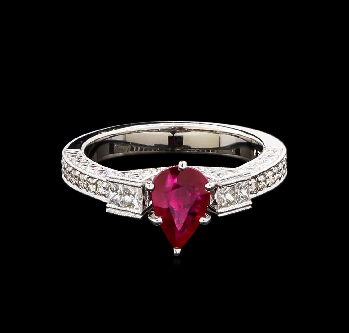 One electronically tested 18KT white gold ladies cast ruby and diamond ring. The featured ruby is supported by a diamond under gallery and diamond set shoulders, completed by a three millimeter wide band. Bright polish finish with milgrain detailing. Identified with markings of "18K". Condition is new, good workmanship. Containing: One prong set pear mixed cut natural ruby, measuring 8.10 x 5.60 x 3.20mm, approximate weight of 1.16ct., clarity is heavily included, type II, medium dark, moderately strong, slightly purplish red color, (GIA slpR 6/4), cut is good. Transmitting light somewhat diffusely, transparent to translucent. Naturally occurring internal & external characteristics are present. Graded in the setting. Four channel set princess cut diamonds, measuring 2.20 x 2.10 x 1.58mm (depth est.) approximate total weight of 4 Stones = 0.28ct. Clarity: VS-1. Color: H - I Forty-Two prong set round brilliant cut diamonds, measuring 1.60 - 1.50 x 0.93mm (depth est.) approximate total weight of 42 Stones = 0.61ct. Graded in the setting. Clarity: VS-2 to SI-2. Color: G - I Twelve prong set round brilliant cut diamonds, measuring 1.30 - 1.30 x 0.78mm (depth est.) approximate total weight of 12 Stones = 0.11ct. Graded in the setting. Clarity: VS-2 to SI-1. Color: G - I. Total Weight of Colored Stones 1.16ct. Total Weight of Diamonds 1.00ct. Total Weight of Ring 5.48gm. AIG Appraised at $5,800.00.