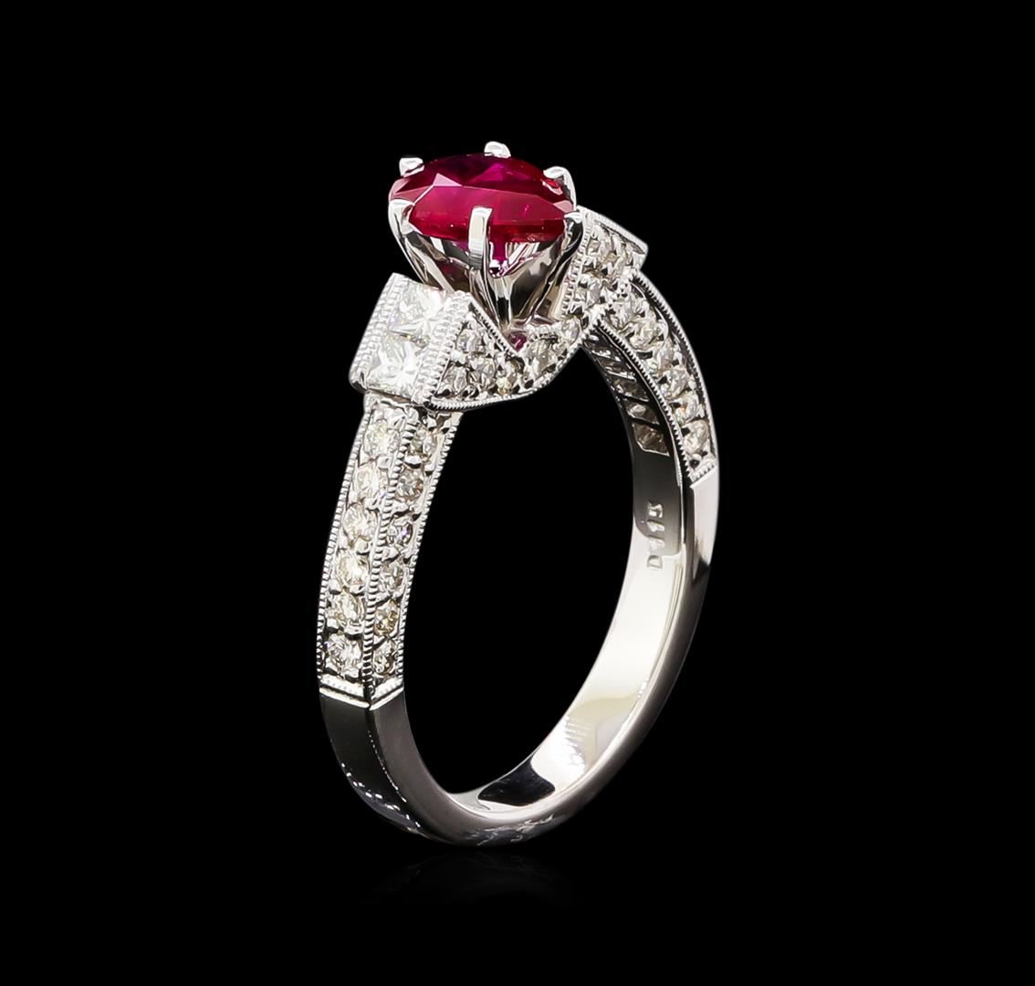 One electronically tested 18KT white gold ladies cast ruby and diamond ring. The featured ruby is supported by a diamond under gallery and diamond set shoulders, completed by a three millimeter wide band. Bright polish finish with milgrain detailing. Identified with markings of "18K". Condition is new, good workmanship. Containing: One prong set pear mixed cut natural ruby, measuring 8.10 x 5.60 x 3.20mm, approximate weight of 1.16ct., clarity is heavily included, type II, medium dark, moderately strong, slightly purplish red color, (GIA slpR 6/4), cut is good. Transmitting light somewhat diffusely, transparent to translucent. Naturally occurring internal & external characteristics are present. Graded in the setting. Four channel set princess cut diamonds, measuring 2.20 x 2.10 x 1.58mm (depth est.) approximate total weight of 4 Stones = 0.28ct. Clarity: VS-1. Color: H - I Forty-Two prong set round brilliant cut diamonds, measuring 1.60 - 1.50 x 0.93mm (depth est.) approximate total weight of 42 Stones = 0.61ct. Graded in the setting. Clarity: VS-2 to SI-2. Color: G - I Twelve prong set round brilliant cut diamonds, measuring 1.30 - 1.30 x 0.78mm (depth est.) approximate total weight of 12 Stones = 0.11ct. Graded in the setting. Clarity: VS-2 to SI-1. Color: G - I. Total Weight of Colored Stones 1.16ct. Total Weight of Diamonds 1.00ct. Total Weight of Ring 5.48gm. AIG Appraised at $5,800.00.