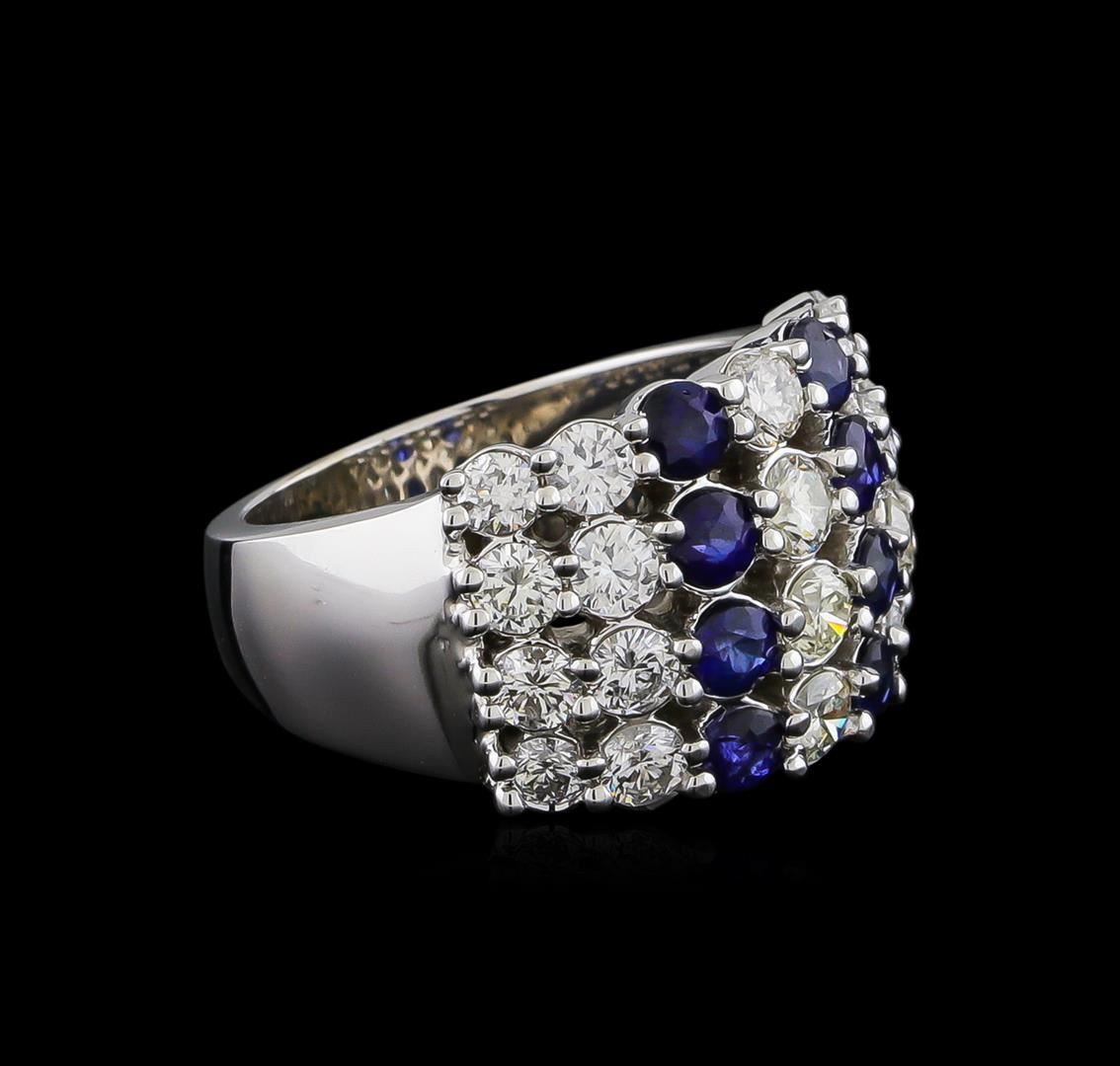 One electronically tested 14KT white gold lady's cast fashion ring with a tapered shank with a bright polish finish. The featured lady's ring has a four row wide band motif with a shank measuring 4.21 millimeters wide. Identified with markings of "14K". Condition is new, good workmanship. Containing: Eight prong set round modified brilliant cut natural blue sapphires, measuring 3.00 - 2.90 x 1.92 mm, approximate total weight of 1.16ct., clarity is slightly included, type II, medium dark, moderately strong, blue color, (GIA B 6/4), cut is good. Transmitting light with a minimum of distortion, transparent. Colored gemstones are presumed to have been subjected to commonly used enhancement processes. Graded in the setting. Four prong set round brilliant cut diamonds, measuring 3.10 - 3.05 x 1.91mm (depth est.) approximate total weight of 4 Stones = 0.44ct. Graded in the setting. Clarity: SI-2 to I-1. Color: H - I. Cut Good Sixteen prong set round brilliant cut diamonds, measuring 2.90 - 2.70 x 1.71mm (depth est.) approximate total weight of 16 Stones = 1.30ct. Graded in the setting. Clarity: SI-1 to I-1. Color: H - I. Cut Good. Total Weight of Colored Stones 1.16ct. Total Weight of Diamonds 1.74ct. Total Weight of Ring 9.60gm. GAS Appraised at $5,970.00.