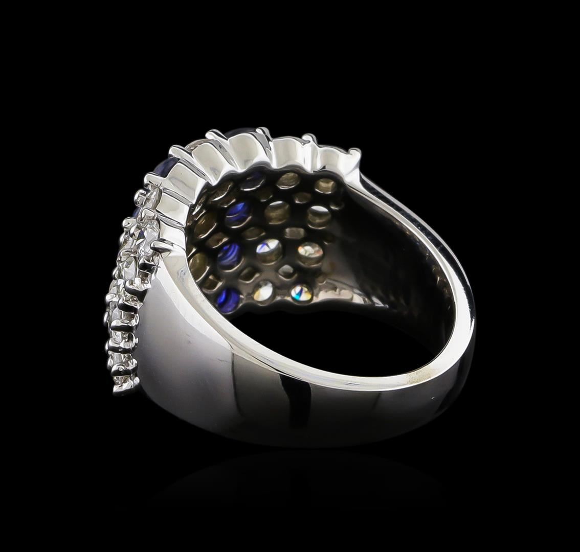 One electronically tested 14KT white gold lady's cast fashion ring with a tapered shank with a bright polish finish. The featured lady's ring has a four row wide band motif with a shank measuring 4.21 millimeters wide. Identified with markings of "14K". Condition is new, good workmanship. Containing: Eight prong set round modified brilliant cut natural blue sapphires, measuring 3.00 - 2.90 x 1.92 mm, approximate total weight of 1.16ct., clarity is slightly included, type II, medium dark, moderately strong, blue color, (GIA B 6/4), cut is good. Transmitting light with a minimum of distortion, transparent. Colored gemstones are presumed to have been subjected to commonly used enhancement processes. Graded in the setting. Four prong set round brilliant cut diamonds, measuring 3.10 - 3.05 x 1.91mm (depth est.) approximate total weight of 4 Stones = 0.44ct. Graded in the setting. Clarity: SI-2 to I-1. Color: H - I. Cut Good Sixteen prong set round brilliant cut diamonds, measuring 2.90 - 2.70 x 1.71mm (depth est.) approximate total weight of 16 Stones = 1.30ct. Graded in the setting. Clarity: SI-1 to I-1. Color: H - I. Cut Good. Total Weight of Colored Stones 1.16ct. Total Weight of Diamonds 1.74ct. Total Weight of Ring 9.60gm. GAS Appraised at $5,970.00.