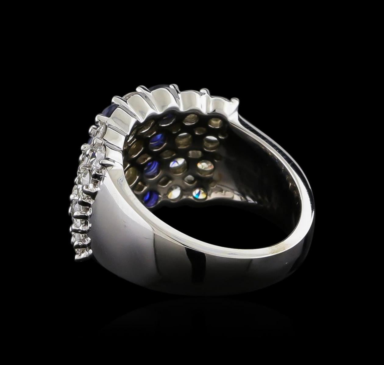 One electronically tested 14KT white gold lady's cast fashion ring with a tapered shank with a bright polish finish. The featured lady's ring has a four row wide band motif with a shank measuring 4.21 millimeters wide. Identified with markings of "14K". Condition is new, good workmanship. Containing: Eight prong set round modified brilliant cut natural blue sapphires, measuring 3.00 - 2.90 x 1.92 mm, approximate total weight of 1.16ct., clarity is slightly included, type II, medium dark, moderately strong, blue color, (GIA B 6/4), cut is good. Transmitting light with a minimum of distortion, transparent. Colored gemstones are presumed to have been subjected to commonly used enhancement processes. Graded in the setting. Four prong set round brilliant cut diamonds, measuring 3.10 - 3.05 x 1.91mm (depth est.) approximate total weight of 4 Stones = 0.44ct. Graded in the setting. Clarity: SI-2 to I-1. Color: H - I. Cut Good Sixteen prong set round brilliant cut diamonds, measuring 2.90 - 2.70 x 1.71mm (depth est.) approximate total weight of 16 Stones = 1.30ct. Graded in the setting. Clarity: SI-1 to I-1. Color: H - I. Cut Good. Total Weight of Colored Stones 1.16ct. Total Weight of Diamonds 1.74ct. Total Weight of Ring 9.60gm. GAS Appraised.