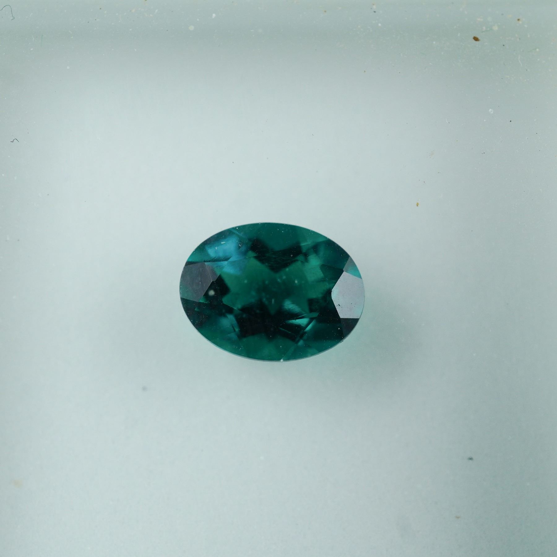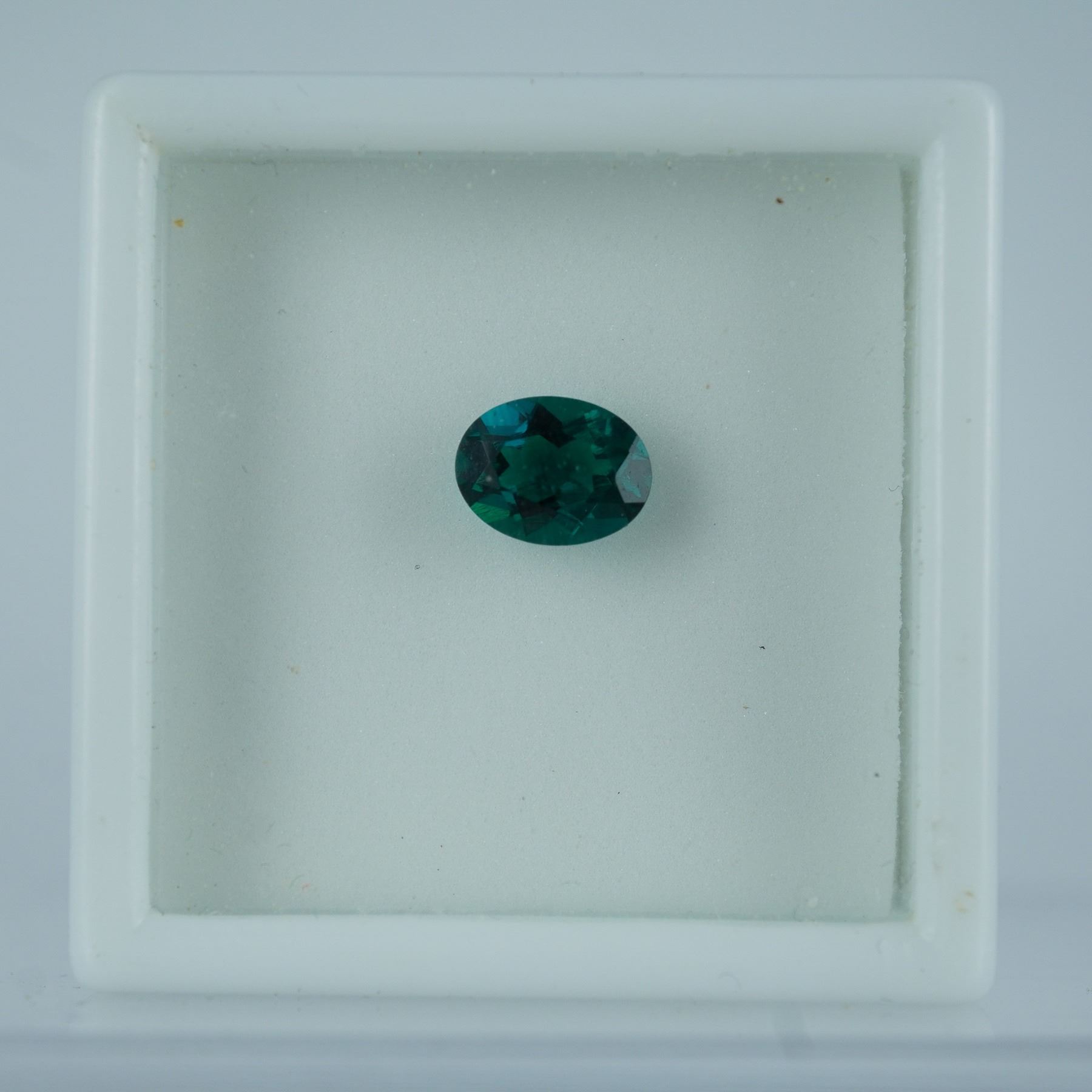 Emerald weighing approximately 1.16 carats, cut in an oval shape and exhibiting a rich green hue. This Russian lab-created gemstone is presented in a protective display case. Synthetic emeralds such as this offer a visually striking and more affordable alternative for fine jewelry or collection purposes.