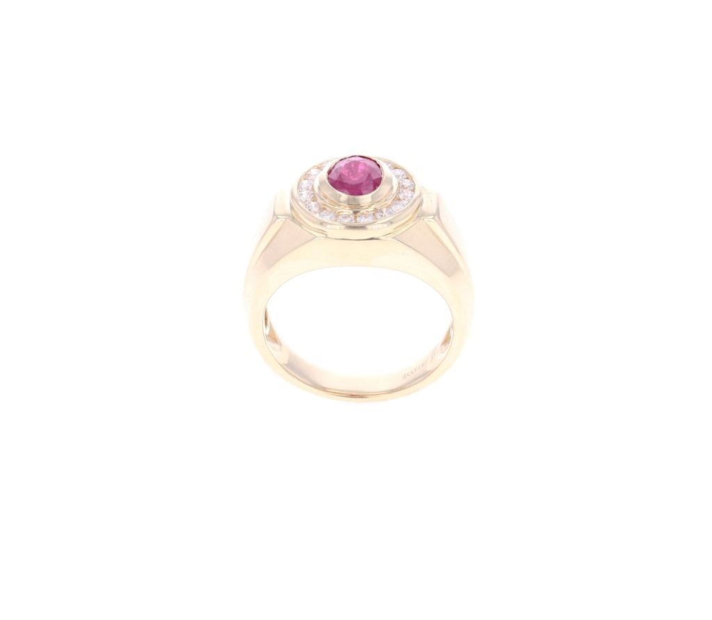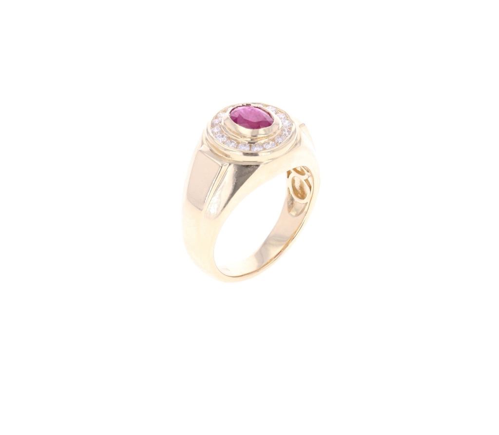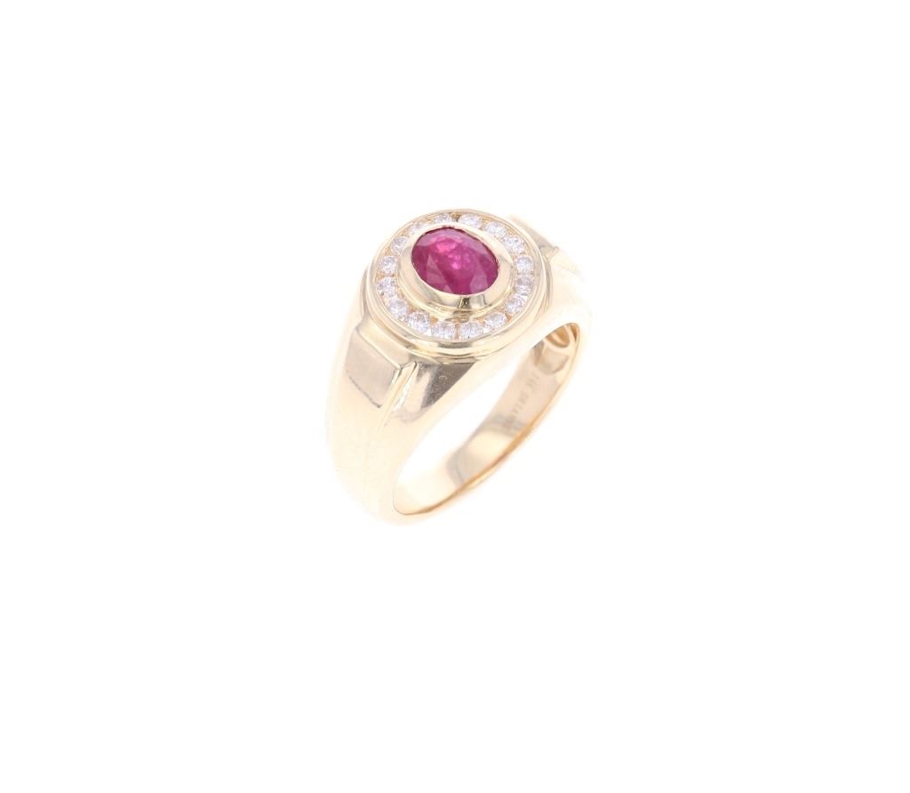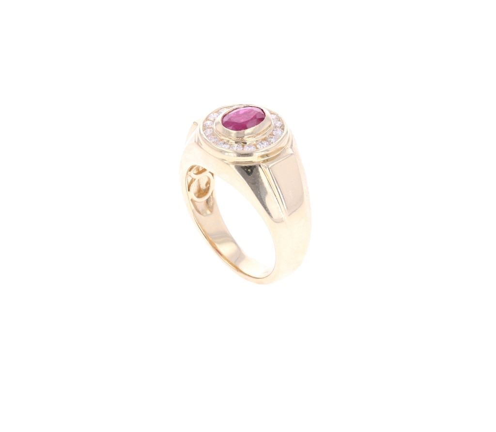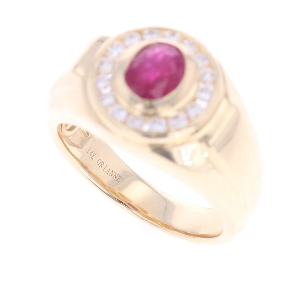 Featured in this lot is this 1.16ct Myanmar ruby and VS2 diamond 14k gold ring with AIGL and GIA paperwork. The ring features a polished, stamped, and tested 14k yellow gold construction that is marked '14k' and 'Orianne' on the inside of this ring band. The ring features a center stone is a oval brilliant cut Burmese (Myanmar) ruby that shows measurements of 7.54 x 5.85 x 3.07mm that shows purplish red coloration and shows slight heat residues and a total weight of 1.16cts. The center stone is decorated with a ring of 16 round brilliant cut diamonds that shows measurements of 2.0mm with VS2 - SI1 clarity and a H - I coloration and shows a total weight of 0.48cts. The ring size is US 10 1/4. The piece comes complete with AIGL Inc.(American International Gemological Laboratories, Inc. a GIA certified lab AIGL#: K36E33-EA17006) report and appraisal confirming the above info and giving a total value of $12,800.00. GIA (Gemological Institute of America) Ruby Grading Report#: 2221075656.