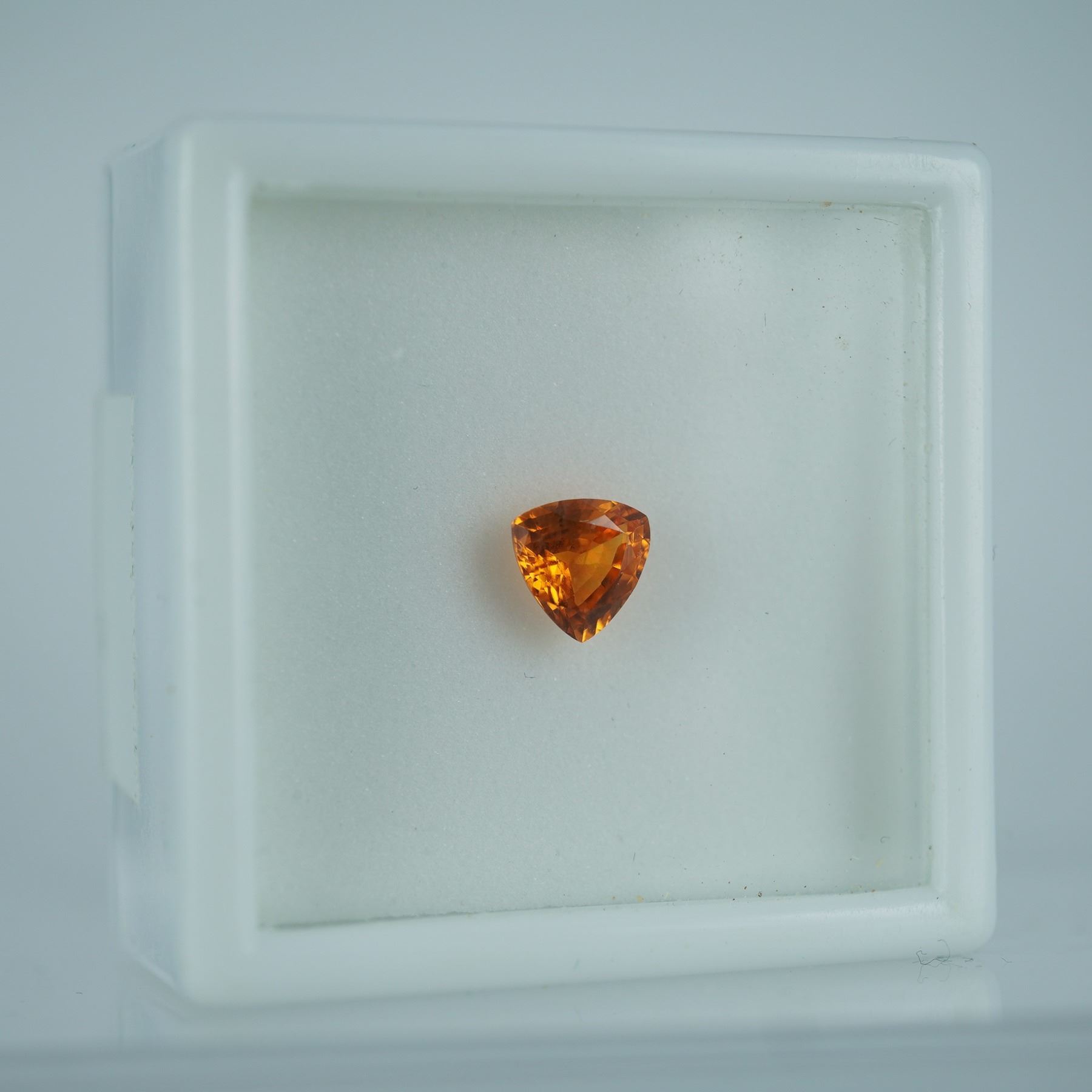 This vivid Nigerian spessartite gemstone weighs approximately 1.17 carats and showcases a brilliant orange hue with exceptional clarity. Its trillion cut enhances the stone's natural radiance, making it an ideal centerpiece for bold, custom jewelry designs. Known for its fiery color and rarity, this spessartite garnet is a standout addition to any fine gemstone collection. The gemstone comes secured in a protective case for safe storage and display.