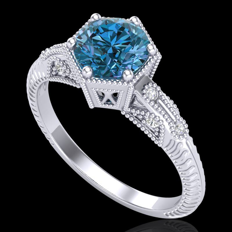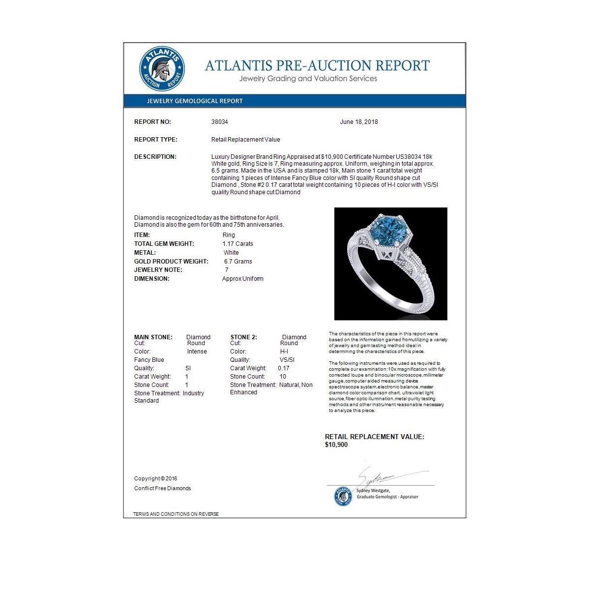 REF-180X2T -38034 ---- 1.17 CTW Fancy Intense Blue Diamond Solitaire Art Deco Ring 18K White Gold ---- Luxury Designer Brand Ring Appraised at $10,900 Certificate Number US38034 18k White gold, Ring Size is 7, Ring measuring approx. Uniform, weighing in total approx. 6.5 grams. Made in the USA and is stamped 18k, Main stone 1 carat total weight containing 1 pieces of Intense Fancy Blue color with SI quality Round shape cut Diamond , Stone #2 0.17 carat total weight containing 10 pieces of H-I color with VS/SI quality Round shape cut Diamond