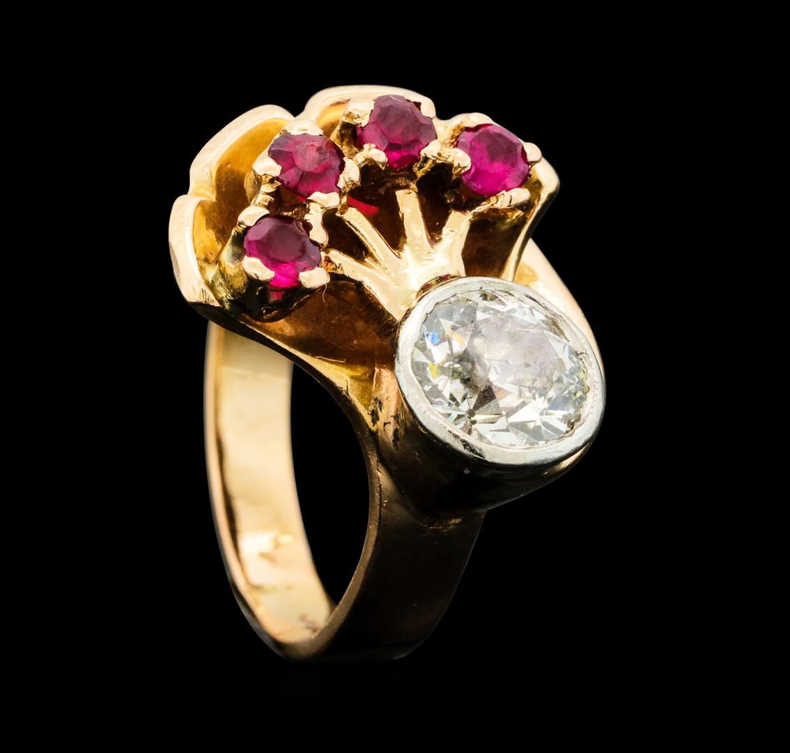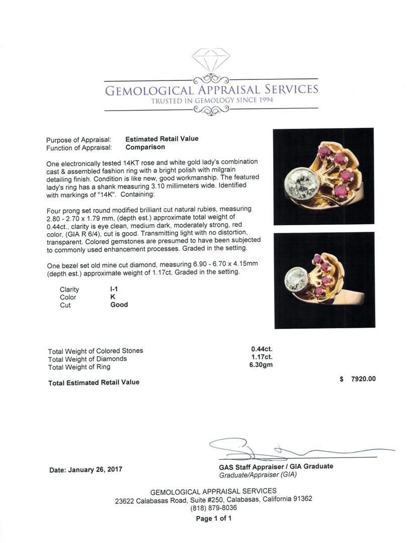 One electronically tested 14KT rose and white gold lady's combination cast & assembled fashion ring with a bright polish with milgrain detailing finish. The featured lady's ring has a shank measuring 3.10 millimeters wide. Identified with markings of '14K'. Condition is like new, good workmanship. Containing: Four prong set round modified brilliant cut natural rubies, measuring 2.80 - 2.70 x 1.79 mm, (depth est.) approximate total weight of 0.44ct., clarity is eye clean, medium dark, moderately strong, red color, (GIA R 6/4), cut is good. Transmitting light with no distortion, transparent. Colored gemstones are presumed to have been subjected to commonly used enhancement processes. Graded in the setting. One bezel set old mine cut diamond, measuring 6.90 - 6.70 x 4.15mm (depth est.) approximate weight of 1.17ct. Graded in the setting. Color K Clarity I-1 Cut Good. Total Weight of Colored Stones 0.44ct.. Total Weight of Diamonds 1.17ct.. Total Weight of Ring 6.30gm. GAS Appraised at $7,920.00.