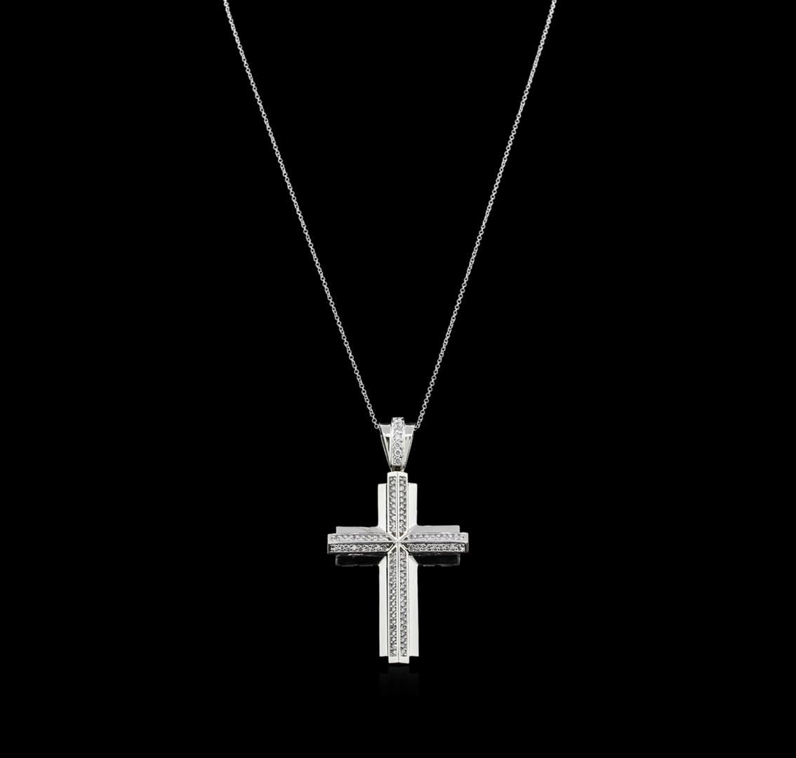 One electronically tested 14KT white gold ladies cast diamond cross pendant and chain 16.0" long, with a spring ring clasp with a bright polish finish. Identified with markings of "14K". Condition is new. Containing: Ninety-Five prong set round brilliant cut diamonds, measuring 1.50 - 1.50 x 0.90mm (depth est.) approximate total weight of 95 Stones = 1.17ct. Clarity: SI-1. Color: H - I, Cut is Good. Diamonds are graded in the mounting, unless otherwise stated. Total Weight of Diamonds 1.17ct. Total Weight of Cross Pendant And Chain 23.30 grams. GGL Appraised at $5,150.00.