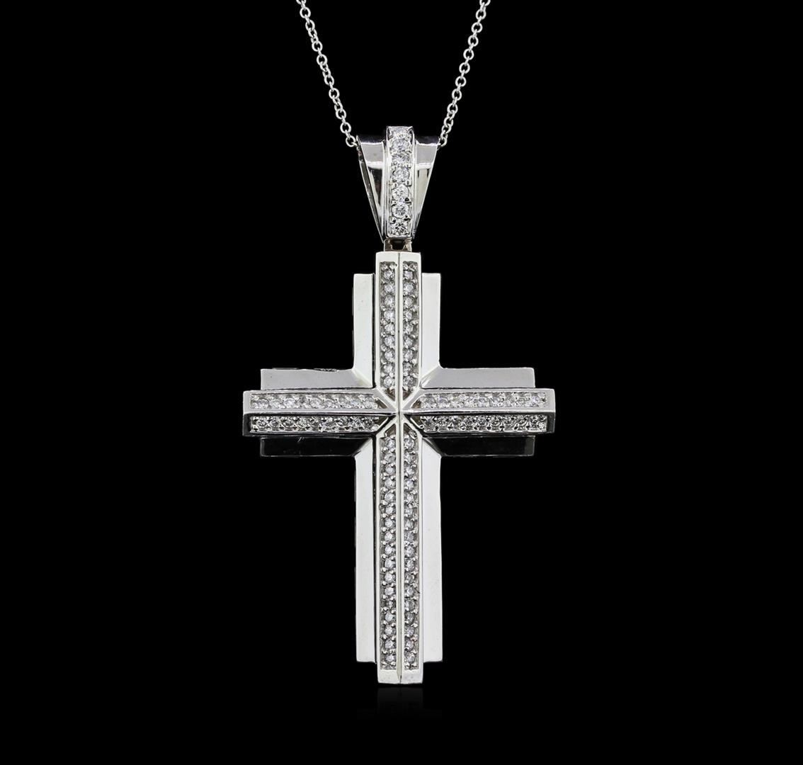 One electronically tested 14KT white gold ladies cast diamond cross pendant and chain 16.0" long, with a spring ring clasp with a bright polish finish. Identified with markings of "14K". Condition is new. Containing: Ninety-Five prong set round brilliant cut diamonds, measuring 1.50 - 1.50 x 0.90mm (depth est.) approximate total weight of 95 Stones = 1.17ct. Clarity: SI-1. Color: H - I, Cut is Good. Diamonds are graded in the mounting, unless otherwise stated. Total Weight of Diamonds 1.17ct. Total Weight of Cross Pendant And Chain 23.30 grams. GGL Appraised at $5,150.00.