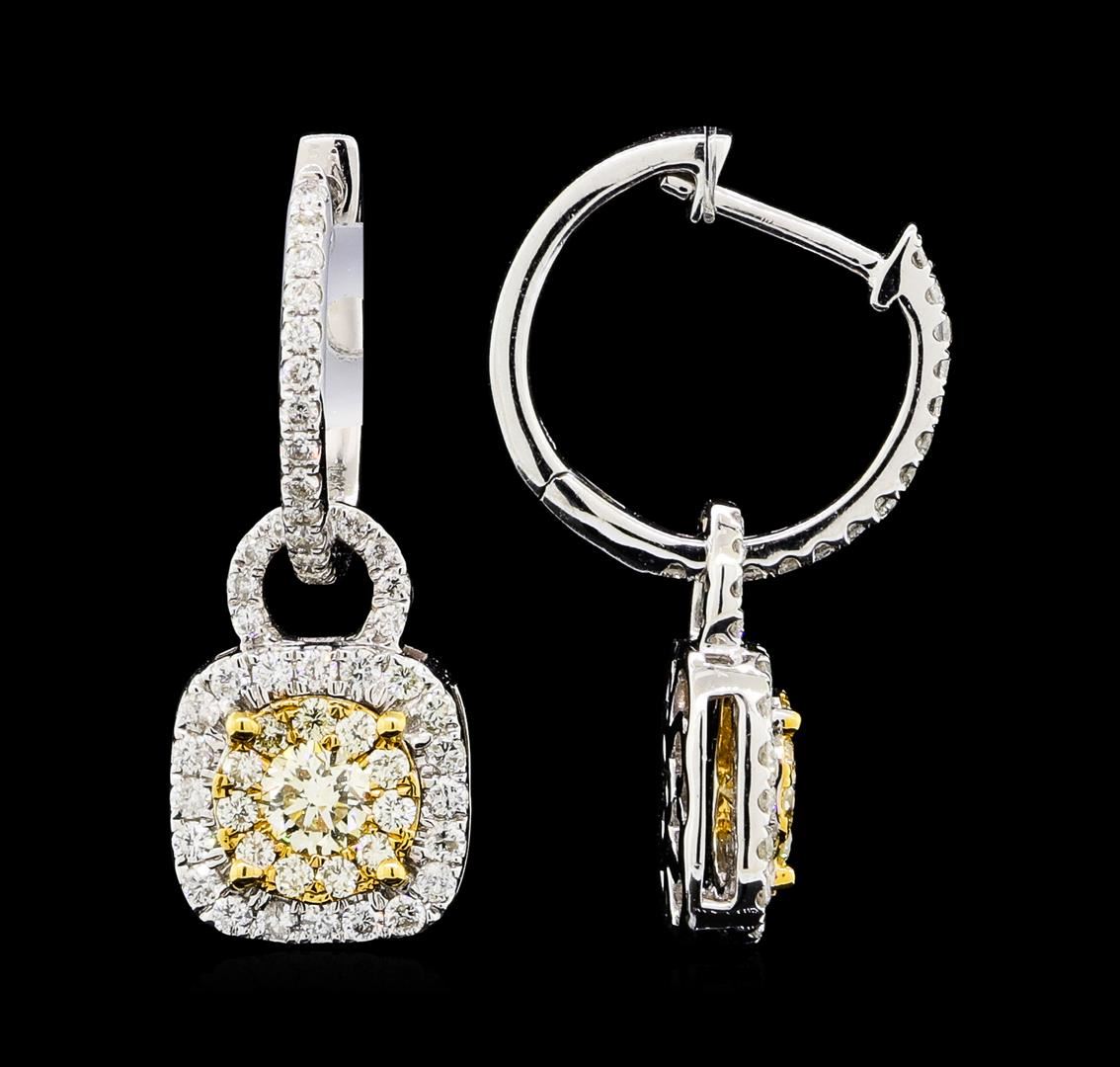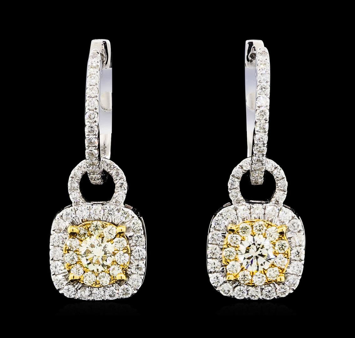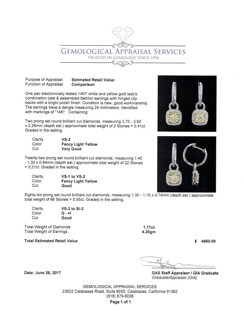 One pair electronically tested 14KT white and yellow gold lady's combination cast & assembled fashion earrings with hinged clip backs with a bright polish finish. The earrings have a dangle measuring 24 millimeters. Identified with markings of '14K'. Condition is new, good workmanship. Containing: Two prong set round brilliant cut diamonds, measuring 3.70 - 3.60 x 2.26mm (depth est.) approximate total weight of 2 Stones = 0.41ct. Graded in the setting. Color Fancy Light Yellow Clarity VS-2 Cut Very Good Twenty-Two prong set round brilliant cut diamonds, measuring 1.40 - 1.30 x 0.84mm (depth est.) approximate total weight of 22 Stones = 0.21ct. Graded in the setting. Color Fancy Light Yellow Clarity VS-1 to VS-2 Cut Good Eighty-Six prong set round brilliant cut diamonds, measuring 1.30 - 1.15 x 0.74mm (depth est.) approximate total weight of 86 Stones = 0.55ct. Graded in the setting. Color G - H Clarity VS-2 to SI-2 Cut Good. Total Weight of Diamonds 1.17ct.. Total Weight of Earrings 4.20gm GAS Appraised at $4950.00. GAS Appraised at $4,950.00.