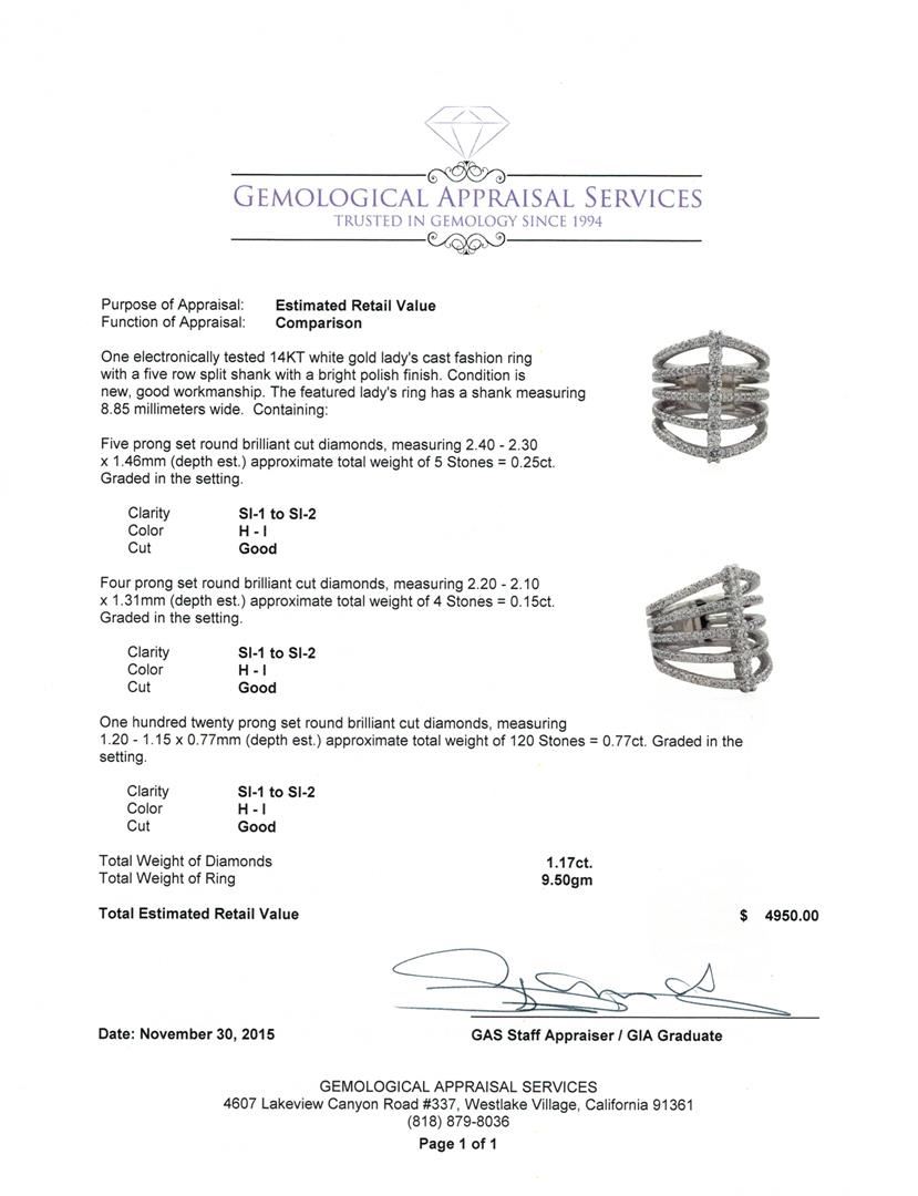 One electronically tested 14KT white gold lady's cast fashion ring with a five row split shank with a bright polish finish. The featured lady's ring has a shank measuring 8.85 millimeters wide. Condition is new, good workmanship. Containing: Five prong set round brilliant cut diamonds, measuring 2.40 - 2.30 x 1.46mm (depth est.) approximate total weight of 5 Stones = 0.25ct. Graded in the setting. Clarity: SI-1 to SI-2 . Color: H - I. Cut Good Four prong set round brilliant cut diamonds, measuring 2.20 - 2.10 x 1.31mm (depth est.) approximate total weight of 4 Stones = 0.15ct. Graded in the setting. Clarity: SI-1 to SI-2 . Color: H - I. Cut Good One Hundred Twenty prong set round brilliant cut diamonds, measuring 1.20 - 1.15 x 0.77mm (depth est.) approximate total weight of 120 Stones = 0.77ct. Graded in the setting. Clarity: SI-1 to SI-2 . Color: H - I. Cut Good. Total Weight of Diamonds 1.17ct.. Total Weight of Ring 9.50gm at $ 4950.00 GAS Appraised.