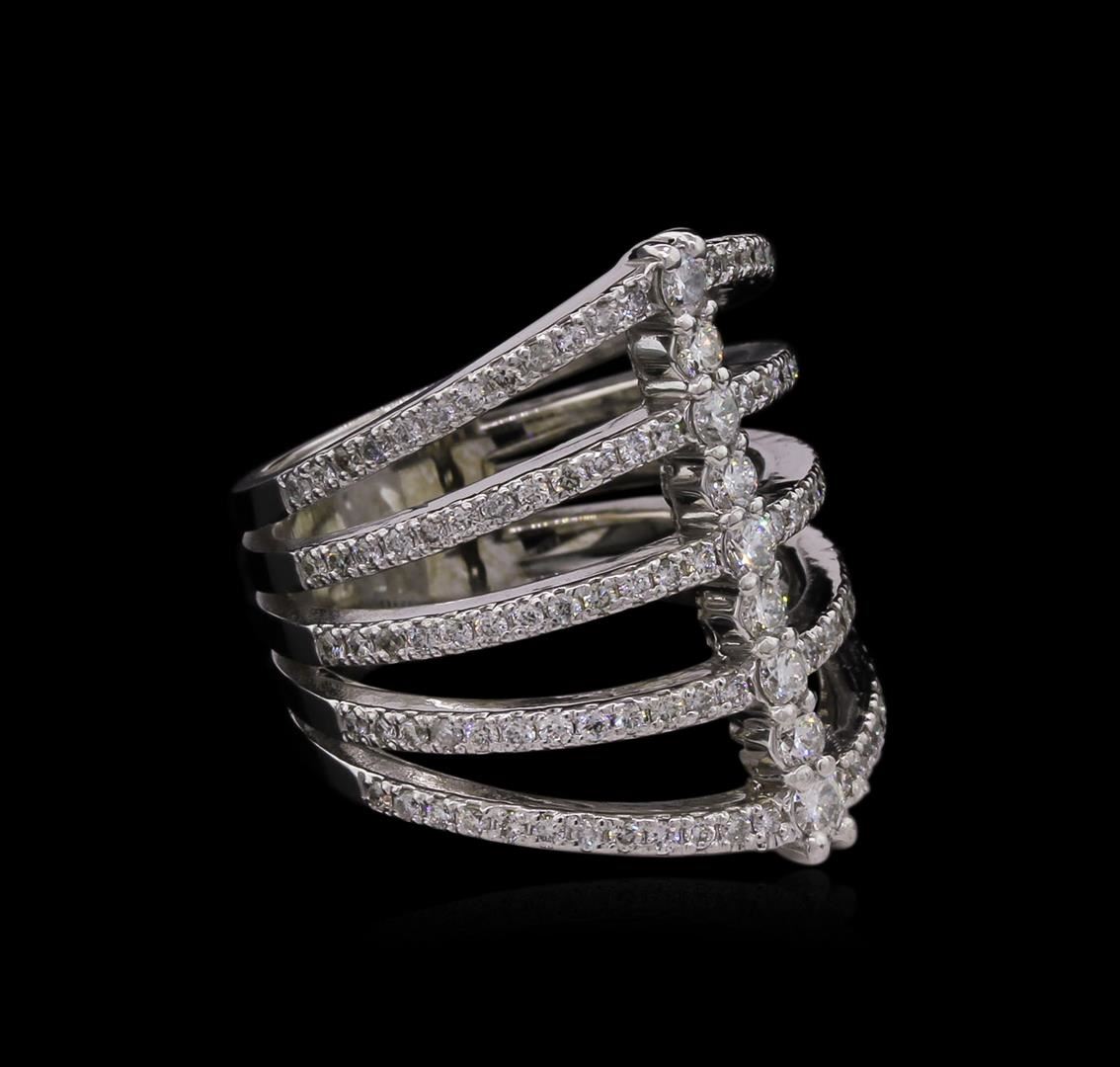 One electronically tested 14KT white gold lady's cast fashion ring with a five row split shank with a bright polish finish. The featured lady's ring has a shank measuring 8.85 millimeters wide. Condition is new, good workmanship. Containing: Five prong set round brilliant cut diamonds, measuring 2.40 - 2.30 x 1.46mm (depth est.) approximate total weight of 5 Stones = 0.25ct. Graded in the setting. Clarity: SI-1 to SI-2 . Color: H - I. Cut Good Four prong set round brilliant cut diamonds, measuring 2.20 - 2.10 x 1.31mm (depth est.) approximate total weight of 4 Stones = 0.15ct. Graded in the setting. Clarity: SI-1 to SI-2 . Color: H - I. Cut Good One Hundred Twenty prong set round brilliant cut diamonds, measuring 1.20 - 1.15 x 0.77mm (depth est.) approximate total weight of 120 Stones = 0.77ct. Graded in the setting. Clarity: SI-1 to SI-2 . Color: H - I. Cut Good. Total Weight of Diamonds 1.17ct.. Total Weight of Ring 9.50gm at $ 4950.00 GAS Appraised.