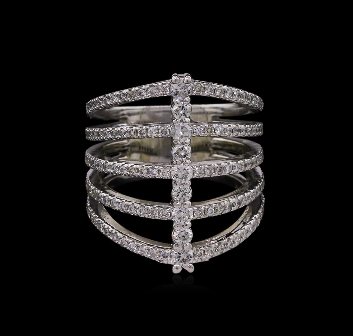One electronically tested 14KT white gold lady's cast fashion ring with a five row split shank with a bright polish finish. The featured lady's ring has a shank measuring 8.85 millimeters wide. Condition is new, good workmanship. Containing: Five prong set round brilliant cut diamonds, measuring 2.40 - 2.30 x 1.46mm (depth est.) approximate total weight of 5 Stones = 0.25ct. Graded in the setting. Clarity: SI-1 to SI-2 . Color: H - I. Cut Good Four prong set round brilliant cut diamonds, measuring 2.20 - 2.10 x 1.31mm (depth est.) approximate total weight of 4 Stones = 0.15ct. Graded in the setting. Clarity: SI-1 to SI-2 . Color: H - I. Cut Good One Hundred Twenty prong set round brilliant cut diamonds, measuring 1.20 - 1.15 x 0.77mm (depth est.) approximate total weight of 120 Stones = 0.77ct. Graded in the setting. Clarity: SI-1 to SI-2 . Color: H - I. Cut Good. Total Weight of Diamonds 1.17ct.. Total Weight of Ring 9.50gm at $ 4950.00 GAS Appraised.