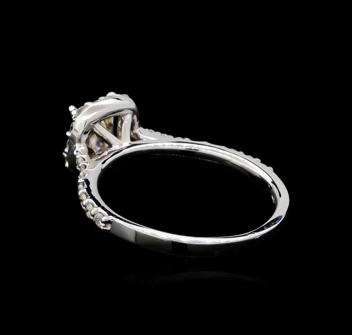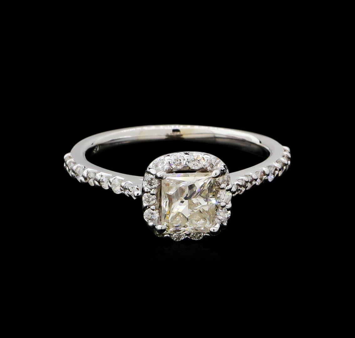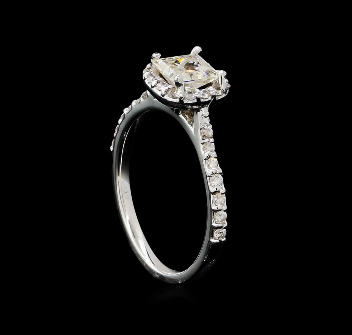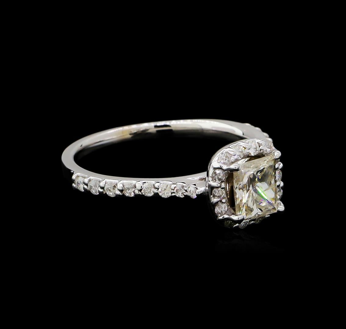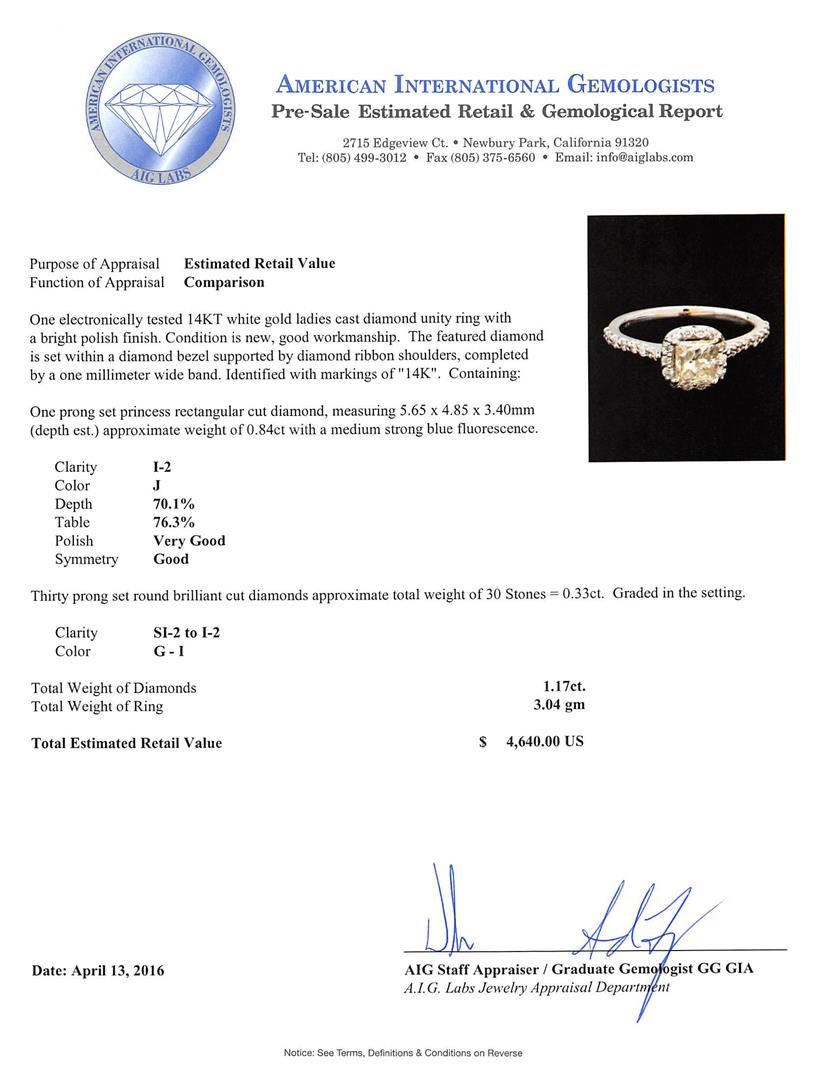 One electronically tested 14KT white gold ladies cast diamond unity ring with a bright polish finish. The featured diamond is set within a diamond bezel supported by diamond ribbon shoulders, completed by a one millimeter wide band. Identified with markings of "14K". Condition is new, good workmanship. Containing: One prong set princess rectangular cut diamond, measuring 5.65 x 4.85 x 3.40mm (depth est.) approximate weight of 0.84ct with a medium strong blue fluorescence. Clarity: I-2. Color: J. Depth 70.1%. Table 76.3%. Thirty prong set round brilliant cut diamonds approximate total weight of 30 Stones = 0.33ct. Graded in the setting. Clarity: SI-2 to I-2. Color: G - I. Total Weight of Diamonds 1.17ct. Total Weight of Ring 3.04gm. AIG Appraised at $4,640.00.
