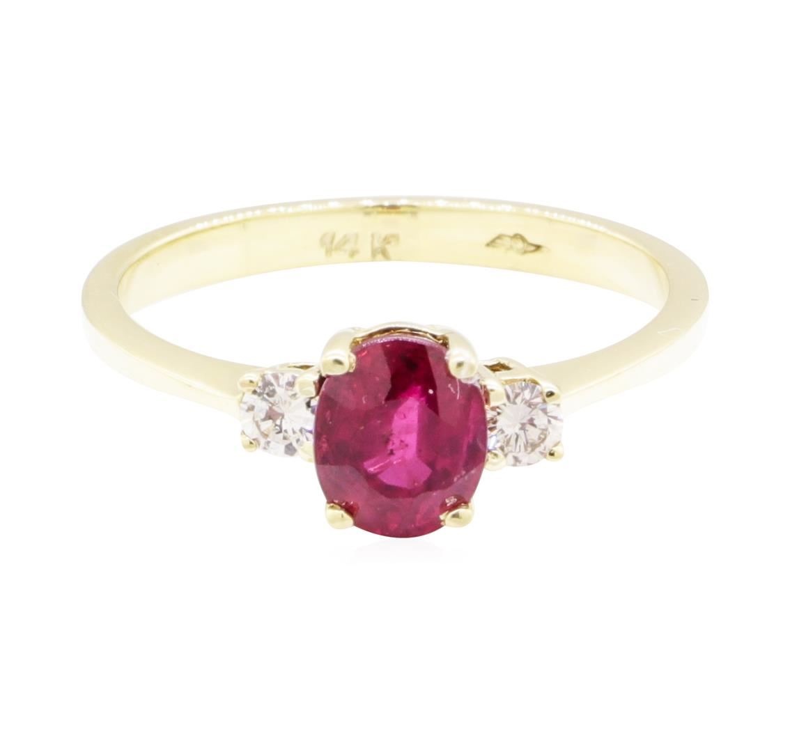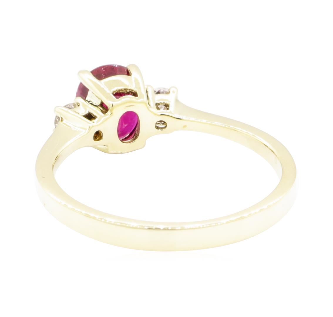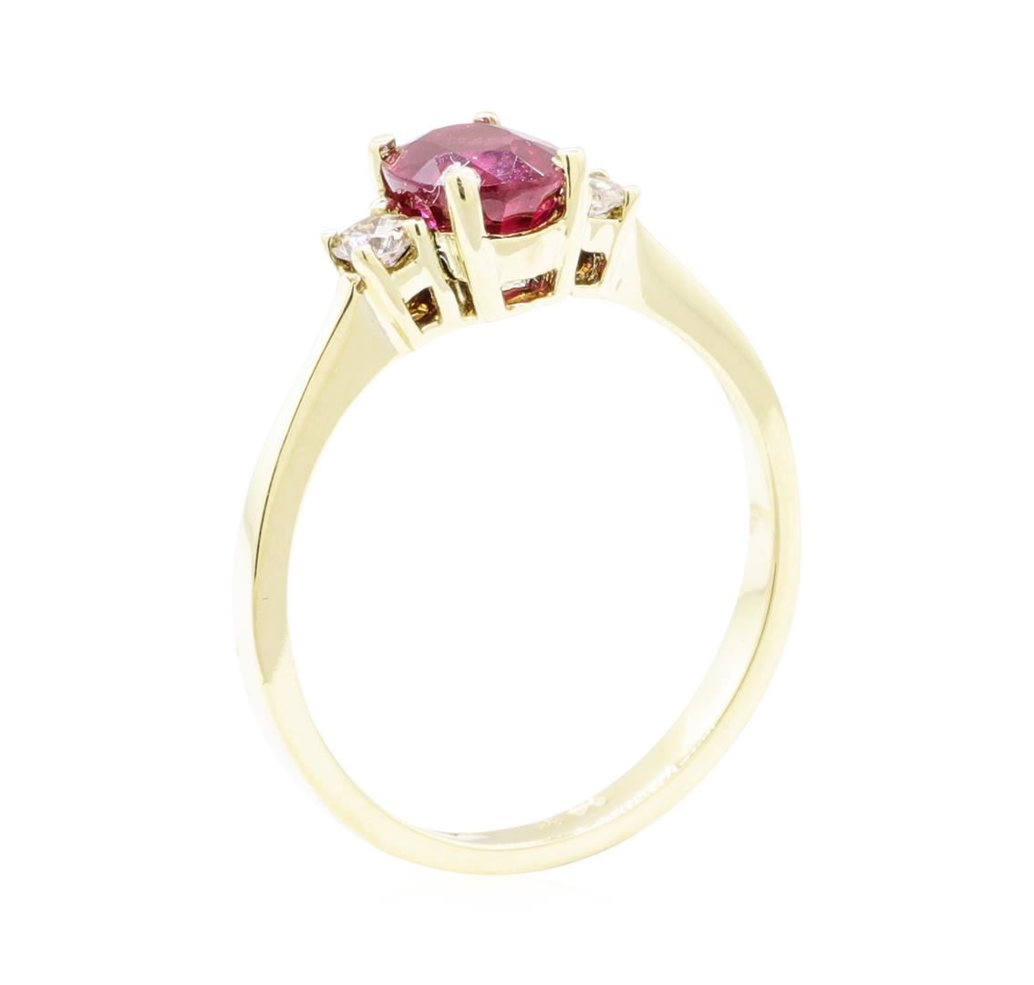 One electronically tested 14KT yellow gold lady's cast three stone ring with a cathedral shank with a bright polish finish. The featured lady's ring has a shank measuring 2.00 millimeters wide. Identified with markings of '14K'. Condition is new, good workmanship. Containing: One prong set oval modified mixed cut natural ruby, measuring 6.36 x 5.25 x 3.71mm, (depth est.) approximate weight of 1.04ct., clarity is slightly included, medium dark, moderately strong, red color, (GIA R 6/4), cut is good. Transmitting light with a minimum of distortion, transparent. Colored gemstones are presumed to have been subjected to commonly used enhancement processes. Graded in the setting. Two prong set round brilliant cut diamonds, measuring 2.60 - 2.55 x 1.60mm (depth est.) approximate total weight of 2 Stones = 0.13ct. Graded in the setting. Color H - I Clarity VS-2 to SI-1 Cut Very Good. Total Weight of Colored Stones 1.04ct.. Total Weight of Diamonds 0.13ct.. Total Weight of Ring 2.40gm GAS Appraised at $4230.00. GAS Appraised at $4,230.00.