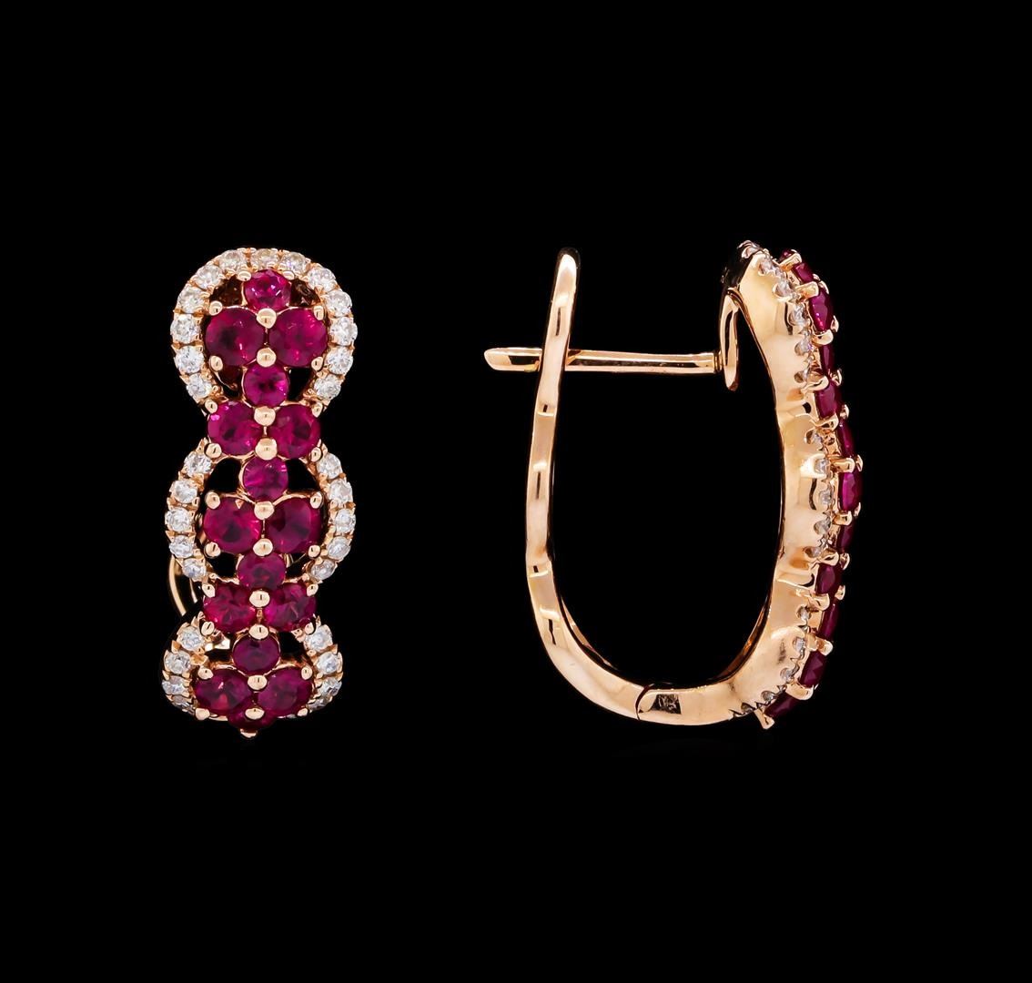 One pair of ruby and diamond earrings featuring: 14KT rose gold weighing 2.7 grams containing rubies weighing 1.17 grams containing diamonds weighing 0.25ctw.