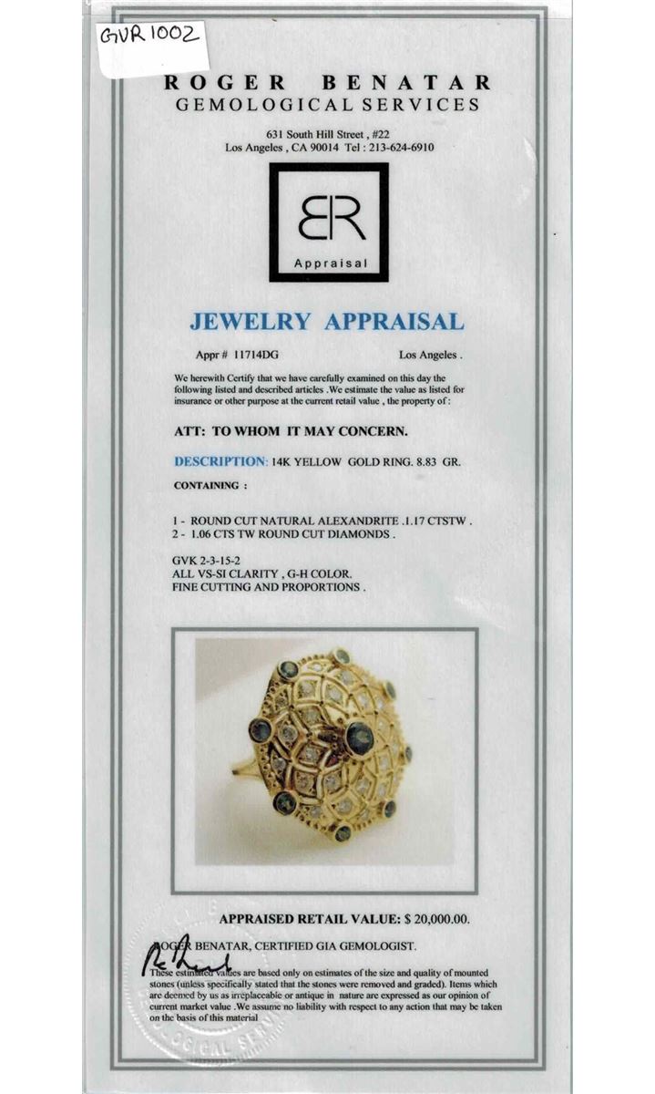 14K YELLOW GOLD NATURAL ALEXANDRITE RING:8.83 GRAMS/DIAMOND:1.06CT/ALEXANDRITE:1.17CT/#GVR1002