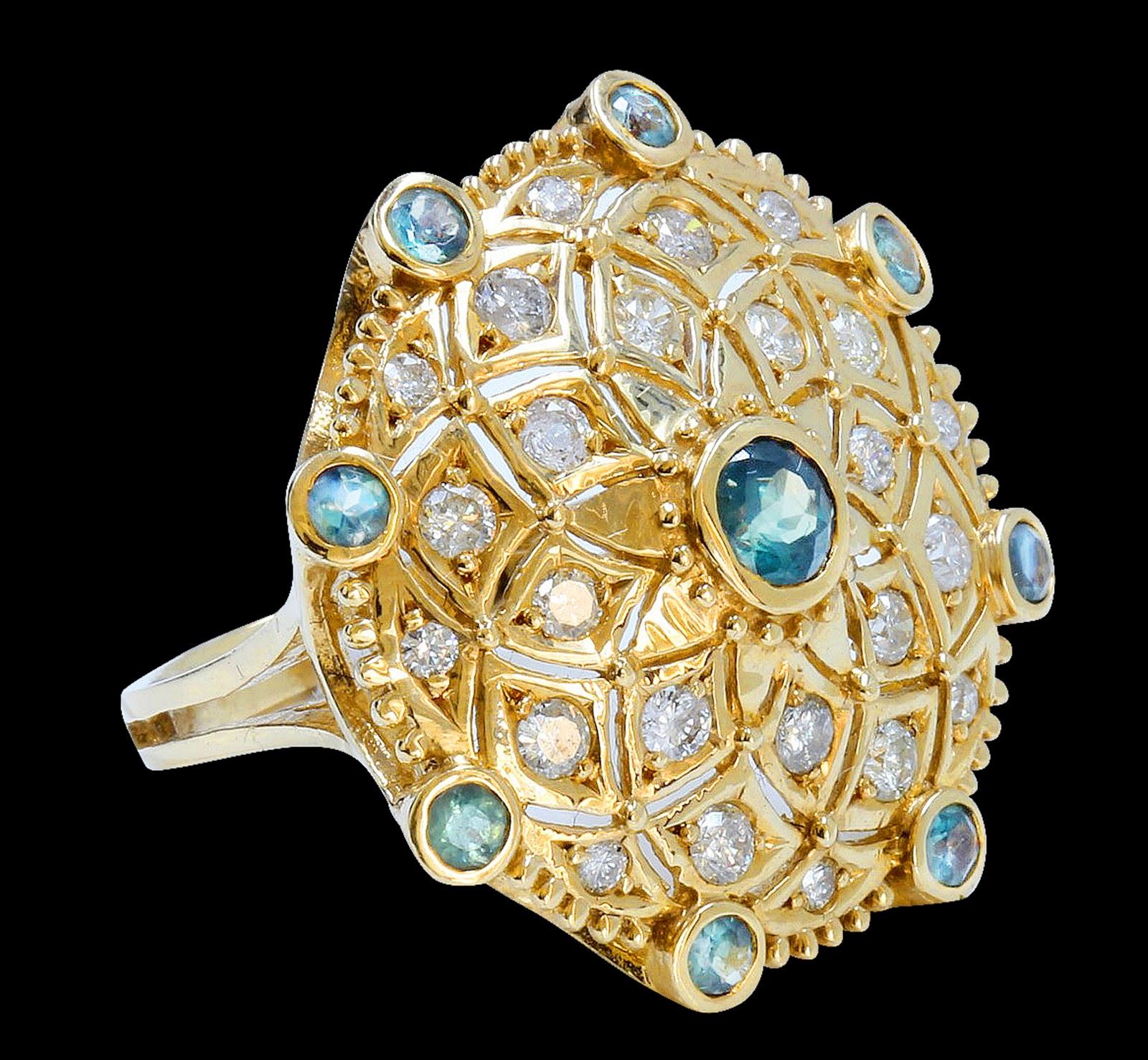 14K YELLOW GOLD NATURAL ALEXANDRITE RING:8.83 GRAMS/DIAMOND:1.06CT/ALEXANDRITE:1.17CT/#GVR1002 **Crafted in warm 14k yellow gold, this elegant display of sparkling, rare 1.17ct round cut natural turquoise and blue colored Alexandrite are stones of joy, with a vibrational connection to source energies of the higher dimension. Generously adorned with shimmering 1.06ct round cut diamonds, this ring is a glittering bouquet of timeless beauty. **