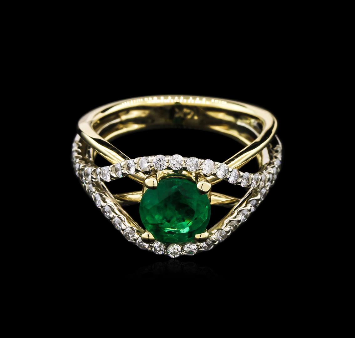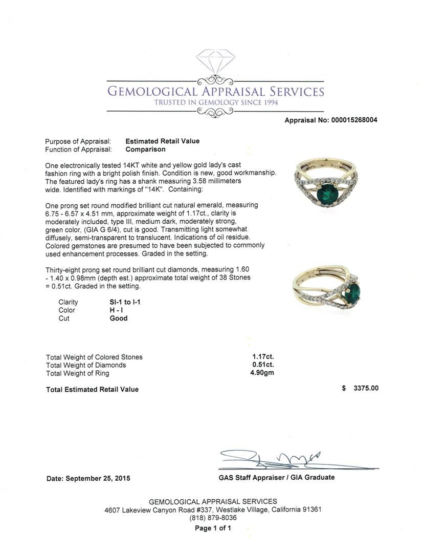 One electronically tested 14KT white and yellow gold lady's cast fashion ring with a bright polish finish. The featured lady's ring has a shank measuring 3.58 millimeters wide. Identified with markings of "14K". Condition is new, good workmanship. Containing: One prong set round modified brilliant cut natural emerald, measuring 6.75 - 6.57 x 4.51 mm, approximate weight of 1.17ct., clarity is moderately included, type III, medium dark, moderately strong, green color, (GIA G 6/4), cut is good. Transmitting light somewhat diffusely, semi-transparent to translucent. Indications of oil residue. Colored gemstones are presumed to have been subjected to commonly used enhancement processes. Graded in the setting. Thirty-Eight prong set round brilliant cut diamonds, measuring 1.60 - 1.40 x 0.98mm (depth est.) approximate total weight of 38 Stones = 0.51ct. Graded in the setting. Clarity: SI-1 to I-1. Color: H - I. Cut Good. Total Weight of Colored Stones 1.17ct. Total Weight of Diamonds 0.51ct. Total Weight of Ring 4.90gm at $3375.00.. GAS Appraised at $3,375.00.