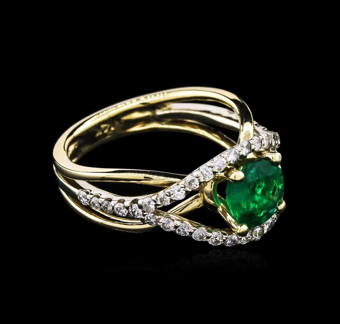 One electronically tested 14KT white and yellow gold lady's cast fashion ring with a bright polish finish. The featured lady's ring has a shank measuring 3.58 millimeters wide. Identified with markings of "14K". Condition is new, good workmanship. Containing: One prong set round modified brilliant cut natural emerald, measuring 6.75 - 6.57 x 4.51 mm, approximate weight of 1.17ct., clarity is moderately included, type III, medium dark, moderately strong, green color, (GIA G 6/4), cut is good. Transmitting light somewhat diffusely, semi-transparent to translucent. Indications of oil residue. Colored gemstones are presumed to have been subjected to commonly used enhancement processes. Graded in the setting. Thirty-Eight prong set round brilliant cut diamonds, measuring 1.60 - 1.40 x 0.98mm (depth est.) approximate total weight of 38 Stones = 0.51ct. Graded in the setting. Clarity: SI-1 to I-1. Color: H - I. Cut Good. Total Weight of Colored Stones 1.17ct. Total Weight of Diamonds 0.51ct. Total Weight of Ring 4.90gm at $3375.00.. GAS Appraised at $3,375.00.