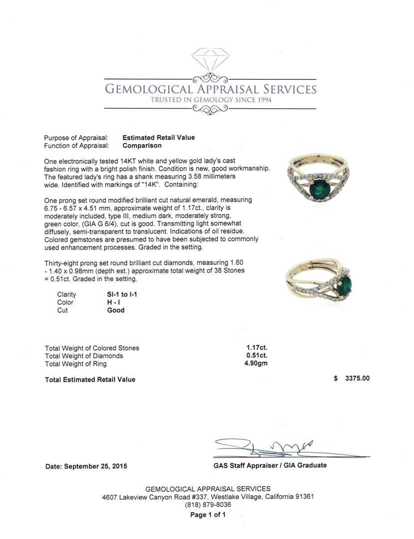 One electronically tested 14KT white and yellow gold lady's cast fashion ring with a bright polish finish. The featured lady's ring has a shank measuring 3.58 millimeters wide. Identified with markings of "14K". Condition is new, good workmanship. Containing: One prong set round modified brilliant cut natural emerald, measuring 6.75 - 6.57 x 4.51 mm, approximate weight of 1.17ct., clarity is moderately included, type III, medium dark, moderately strong, green color, (GIA G 6/4), cut is good. Transmitting light somewhat diffusely, semi-transparent to translucent. Indications of oil residue. Colored gemstones are presumed to have been subjected to commonly used enhancement processes. Graded in the setting. Thirty-Eight prong set round brilliant cut diamonds, measuring 1.60 - 1.40 x 0.98mm (depth est.) approximate total weight of 38 Stones = 0.51ct. Graded in the setting. Clarity: SI-1 to I-1. Color: H - I. Cut Good. Total Weight of Colored Stones 1.17ct. Total Weight of Diamonds 0.51ct. Total Weight of Ring 4.90gm at $3375.00.. GAS Appraised at $3,375.00.