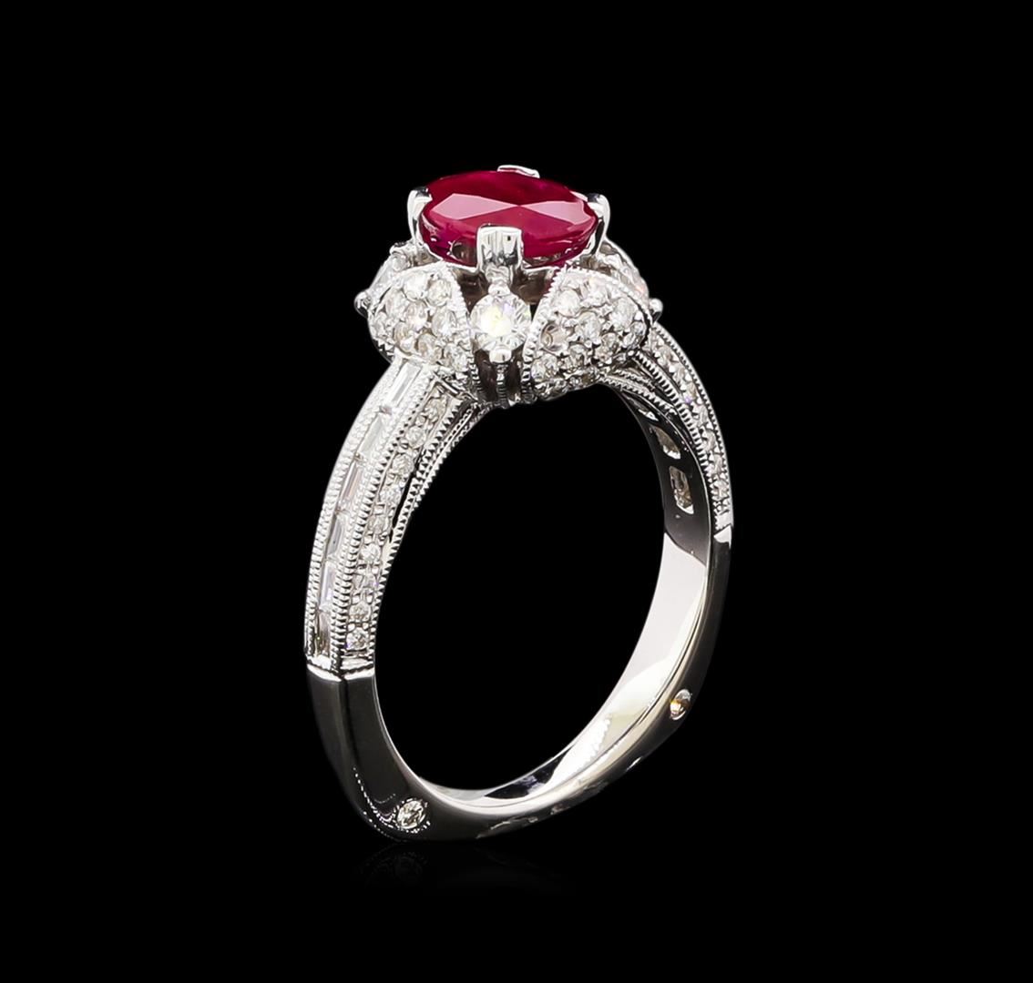 One electronically tested 18KT white gold ladies cast ruby and diamond ring. The featured ruby is set within a stylized diamond curvature supported by diamond set shoulders, completed by a two millimeter wide European style band with diamond set corners. Bright polish finish with milgrain detailing. Identified with markings of "18K 750". Condition is new, good workmanship. Containing: One prong set oval mixed cut natural ruby, measuring 7.70 x 5.75 x 3.00mm, 5%. bulge factor, approximate weight of 1.17ct., clarity is heavily included, type II, medium dark, very slightly brownish, slightly purplish red color, (GIA slpR 6/3) Transmitting light somewhat diffusely, transparent to translucent. Naturally occurring internal & external characteristics are present. Graded in the setting. Four prong set round brilliant cut diamonds, measuring 2.40 - 2.30 x 1.41mm (depth est.) approximate total weight of 4 Stones = 0.25ct. Graded in the setting. Clarity: VS-2 to SI-1. Color: G - I Twelve prong set baguette cut (tapered) diamonds, measuring from 2.00 x 1.00 x 0.70mm (depth est.) to 2.10 x 1.10 x 0.77mm (depth est.) approximate total weight of 12 Stones = 0.22ct. Graded in the setting. Clarity: VS-2 to SI-1. Color: G - I Eighty-Eight prong & bezel set round brilliant cut diamonds, measuring 1.20 - 0.80 x 0.60mm (depth est.) approximate total weight of 88 Stones = 0.53ct. Graded in the setting. Clarity: SI-1 to SI-2. Color: G - I. Total Weight of Colored Stones 1.17ct. Total Weight of Diamonds 1.00ct. Total Weight of Ring 6.29gm. AIG Appraised at $6,200.00.