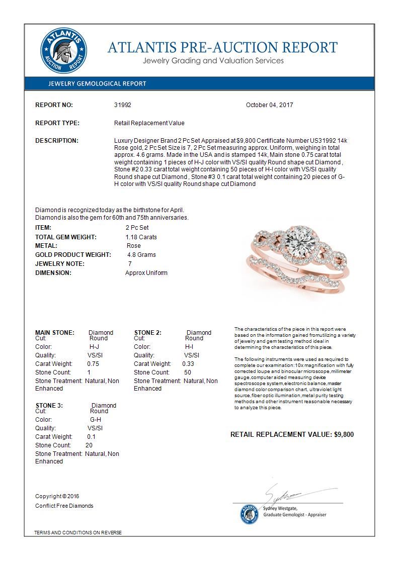 31992 - REF-197W8H ---- 1.18 CTW Certified VS/SI Diamond Solitaire 2Pc Wedding Set 14K Rose Gold ---- Luxury Designer Brand 2 Pc Set Appraised at $9,800 Certificate Number US31992 14k Rose gold, 2 Pc Set Size is 7, 2 Pc Set measuring approx. Uniform, weighing in total approx. 4.6 grams. Made in the USA and is stamped 14k, Main stone 0.75 carat total weight containing 1 pieces of H-J color with VS/SI quality Round shape cut Diamond , Stone #2 0.33 carat total weight containing 50 pieces of H-I color with VS/SI quality Round shape cut Diamond , Stone #3 0.1 carat total weight containing 20 pieces of G-H color with VS/SI quality Round shape cut Diamond