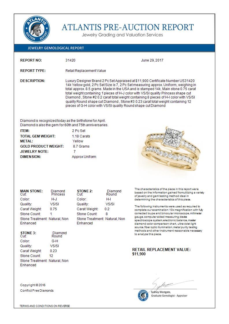 1.18 CTW Certified VS/SI Princess Diamond Solitaire 2Pc Set Antique 14K Yellow Gold ---- Luxury Designer Brand 2 Pc Set Appraised Retail Price at $11,900 ---- SKU Number US31420 14k Yellow gold 2 Pc Set Size is 7, 2 Pc Set measuring approx. Uniform, weighing in total approx. 8.5 grams. Made in the USA and is stamped 14k, Main stone 0.75 carat total weight containing 1 pieces of H-J color with VS/SI quality Princess shape cut Diamond , Stone #2 0.2 carat total weight containing 8 pieces of H-I color with VS/SI quality Round shape cut