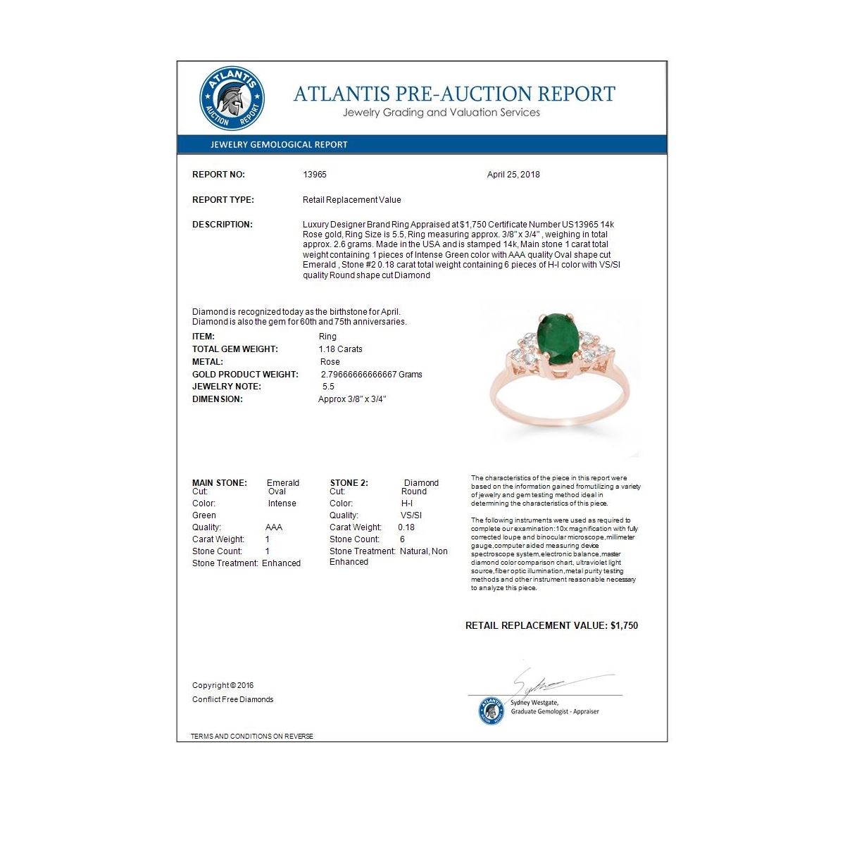 REF-26A4X -13965 ---- 1.18 CTW Emerald & Diamond Ring 14K Rose Gold ---- Luxury Designer Brand Ring Appraised at $1,750 Certificate Number US13965 14k Rose gold, Ring Size is 5.5, Ring measuring approx. 3/8" x 3/4" , weighing in total approx. 2.6 grams. Made in the USA and is stamped 14k, Main stone 1 carat total weight containing 1 pieces of Intense Green color with AAA quality Oval shape cut Emerald , Stone #2 0.18 carat total weight containing 6 pieces of H-I color with VS/SI quality Round shape cut Diamond
