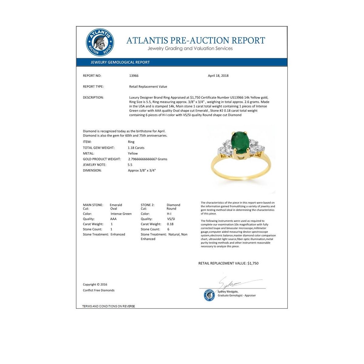 REF-26Y4K -13966 ---- 1.18 CTW Emerald & Diamond Ring 14K Yellow Gold ---- Luxury Designer Brand Ring Appraised at $1,750 Certificate Number US13966 14k Yellow gold, Ring Size is 5.5, Ring measuring approx. 3/8" x 3/4" , weighing in total approx. 2.6 grams. Made in the USA and is stamped 14k, Main stone 1 carat total weight containing 1 pieces of Intense Green color with AAA quality Oval shape cut Emerald , Stone #2 0.18 carat total weight containing 6 pieces of H-I color with VS/SI quality Round shape cut Diamond