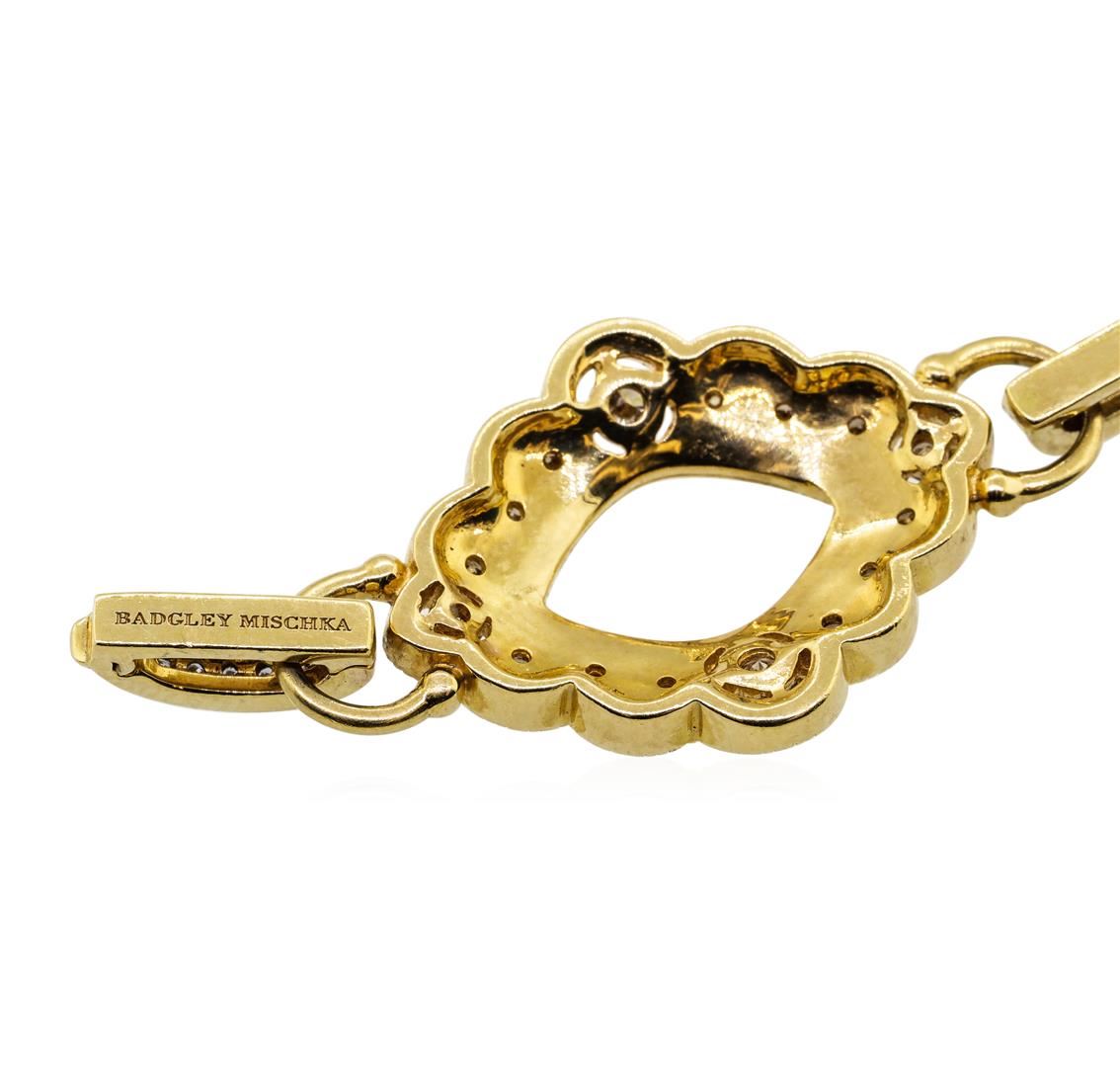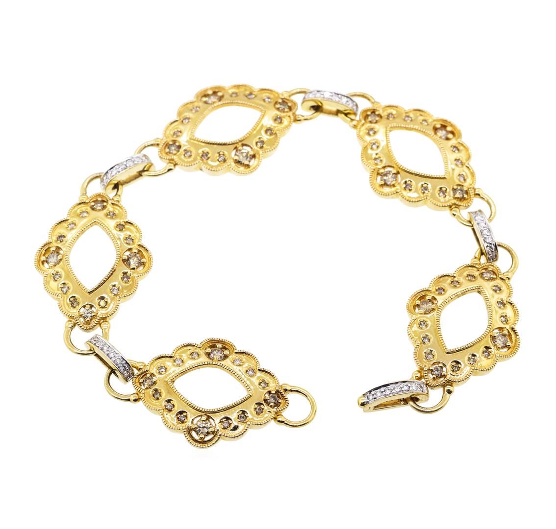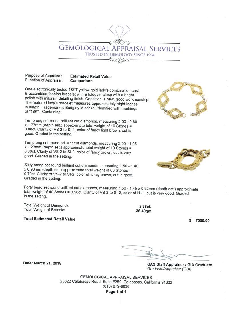 One electronically tested 18KT yellow gold lady's combination cast & assembled fashion bracelet with a foldover clasp with a bright polish with milgrain detailing finish. The featured lady's bracelet measures approximately eight inches in length. Trademark is Badgley Mischka. Identified with markings of '18K'. Condition is new, good workmanship. Containing: Ten prong set round brilliant cut diamonds, measuring 2.90 - 2.80 x 1.77mm (depth est.) approximate total weight of 10 Stones = 0.88ct. Graded in the setting. Color Fancy Light Brown Clarity VS-2 to SI-1 Cut Good Ten prong set round brilliant cut diamonds, measuring 2.00 - 1.95 x 1.23mm (depth est.) approximate total weight of 10 Stones = 0.30ct. Graded in the setting. Color Fancy Brown Clarity VS-2 to SI-2 Cut Very Good Sixty prong set round brilliant cut diamonds, measuring 1.50 - 1.40 x 0.90mm (depth est.) approximate total weight of 60 Stones = 0.70ct. Graded in the setting. Color Fancy Brown Clarity VS-2 to SI-2 Cut Good Forty bead set round brilliant cut diamonds, measuring 1.50 - 1.45 x 0.92mm (depth est.) approximate total weight of 40 Stones = 0.50ct. Graded in the setting. Color H - I Clarity VS-2 to SI-2 Cut Very Good. Total Weight of Diamonds 2.38ct.. Total Weight of Bracelet 36.40gm GAS Appraised at $7000.00. GAS Appraised at $7,000.00.