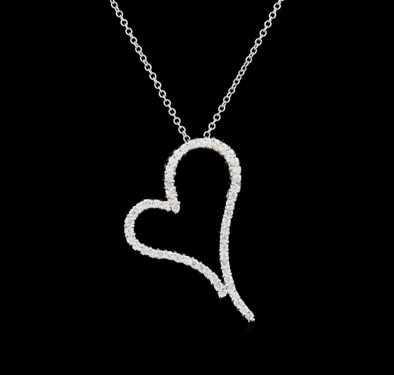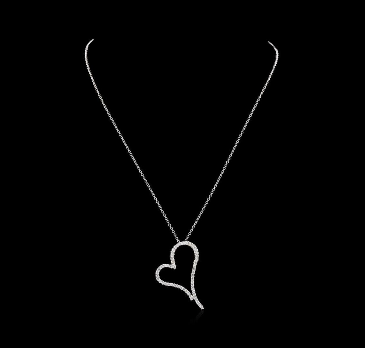 One electronically tested 14KT white gold lady's cast fashion pendant & chain 18.0" long, 1.3 mm round cable link with a lobster claw clasp with a bright polish finish. The featured lady's pendent has a heart shaped motif. Identified with markings of "14K". Condition is new, good workmanship. Containing: Fifty-Six prong set round brilliant cut diamonds, measuring 1.80 - 1.75 x 1.12mm (depth est.) approximate total weight of 56 Stones = 1.18ct. Graded in the setting. Clarity: VS-2 to SI-2. Color: H - I. Cut Very Good. Total Weight of Diamonds 1.18ct. Total Weight of Pendant & Chain 9.50gm. GAS Appraised.