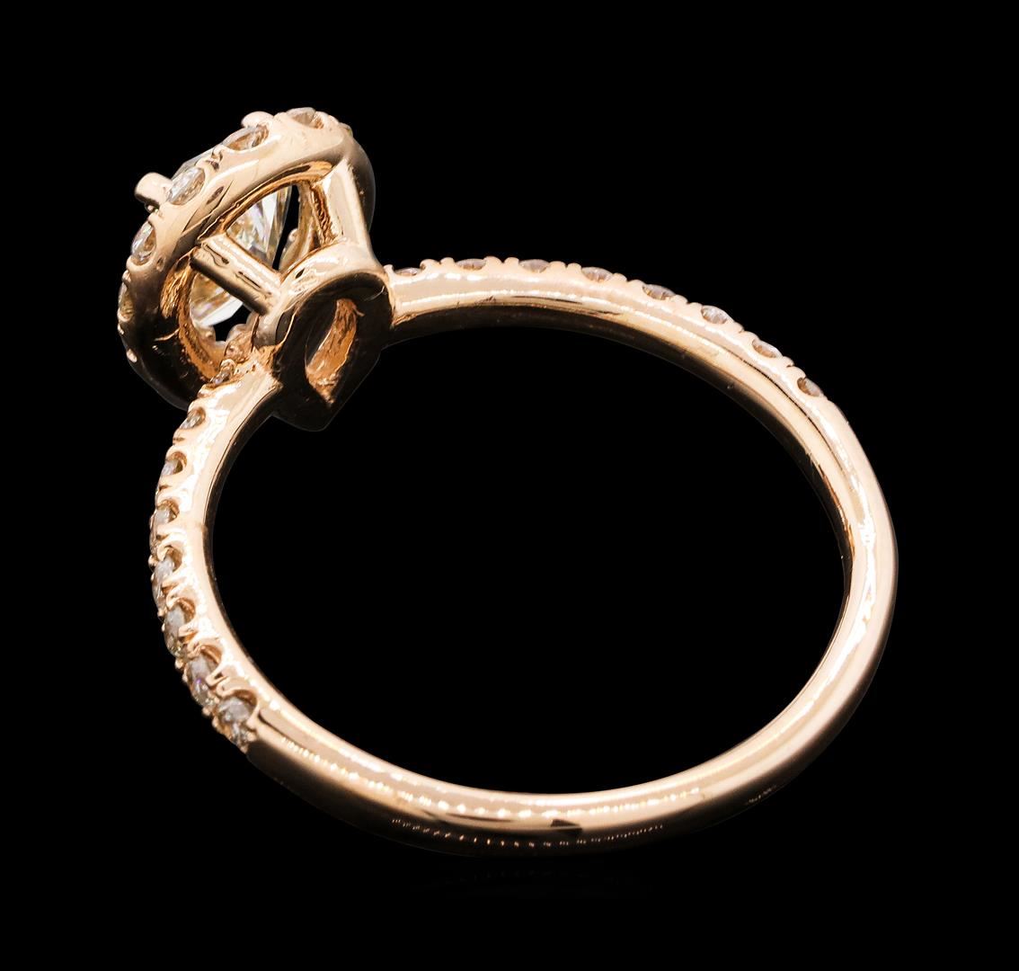 One electronically tested 14KT rose gold lady's cast wedding ring with a basket halo with a bright polish finish. The featured lady's ring has a shank measuring 1.77 millimeters wide. Identified with markings of '14K'. Condition is new, good workmanship. Containing: One prong set pear shaped cut diamond, measuring 7.10 x 4.45 x 3.08mm (depth est.) , 15.00.%. GTCF approximate weight of 0.69ct. Graded in the setting. Color J - K Clarity VS-2 Cut Very Good Thirty prong set round brilliant cut diamonds, measuring 1.70 - 1.60 x 0.99mm (depth est.) approximate total weight of 30 Stones = 0.49ct. Graded in the setting. Color H - I Clarity VS-2 to SI-2 Cut Good. Total Weight of Diamonds 1.18ct.. Total Weight of Ring 2.60gm GAS Appraised at $5,405.00.