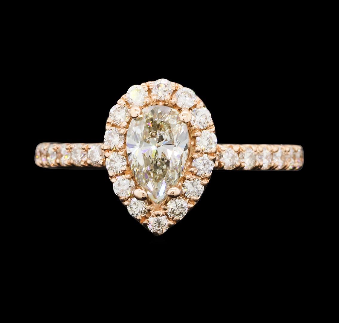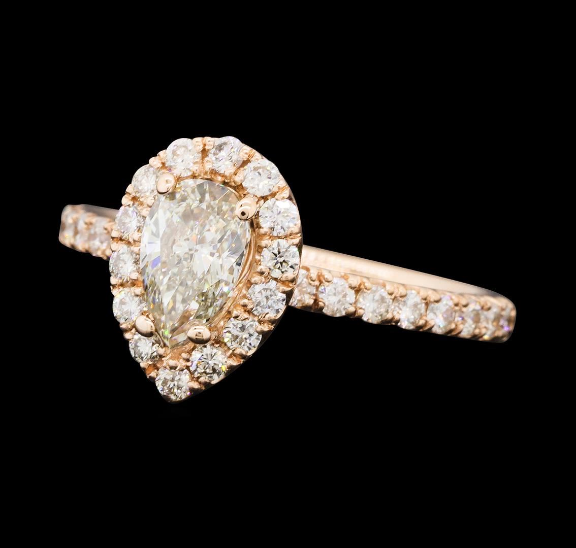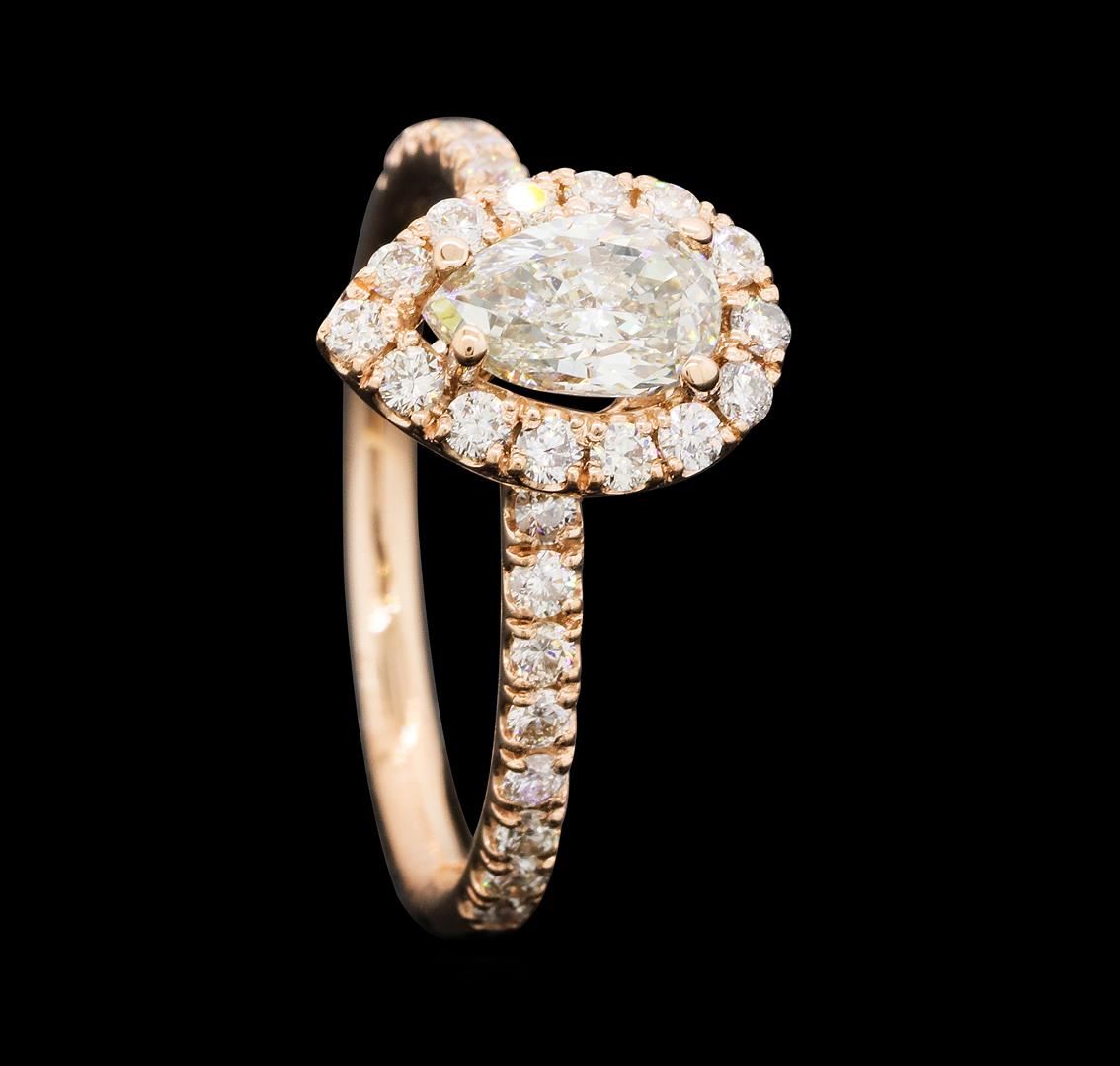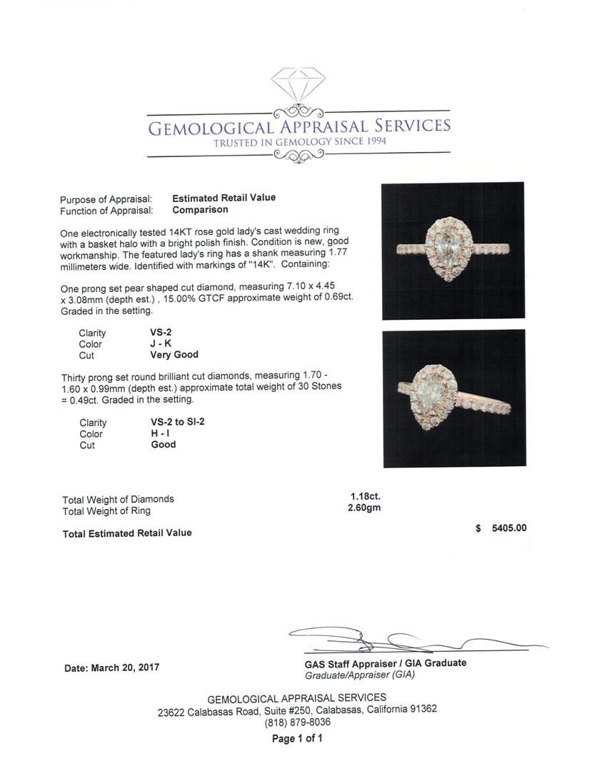 One electronically tested 14KT rose gold lady's cast wedding ring with a basket halo with a bright polish finish. The featured lady's ring has a shank measuring 1.77 millimeters wide. Identified with markings of '14K'. Condition is new, good workmanship. Containing: One prong set pear shaped cut diamond, measuring 7.10 x 4.45 x 3.08mm (depth est.) , 15.00.%. GTCF approximate weight of 0.69ct. Graded in the setting. Color J - K Clarity VS-2 Cut Very Good Thirty prong set round brilliant cut diamonds, measuring 1.70 - 1.60 x 0.99mm (depth est.) approximate total weight of 30 Stones = 0.49ct. Graded in the setting. Color H - I Clarity VS-2 to SI-2 Cut Good. Total Weight of Diamonds 1.18ct.. Total Weight of Ring 2.60gm GAS Appraised at $5,405.00.