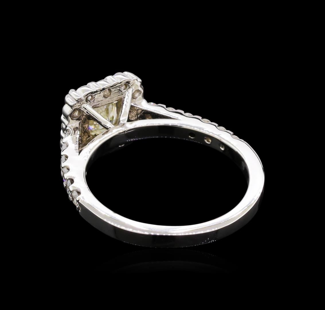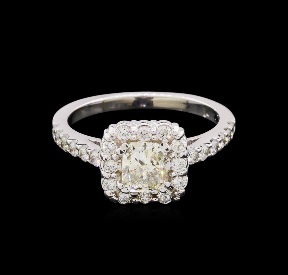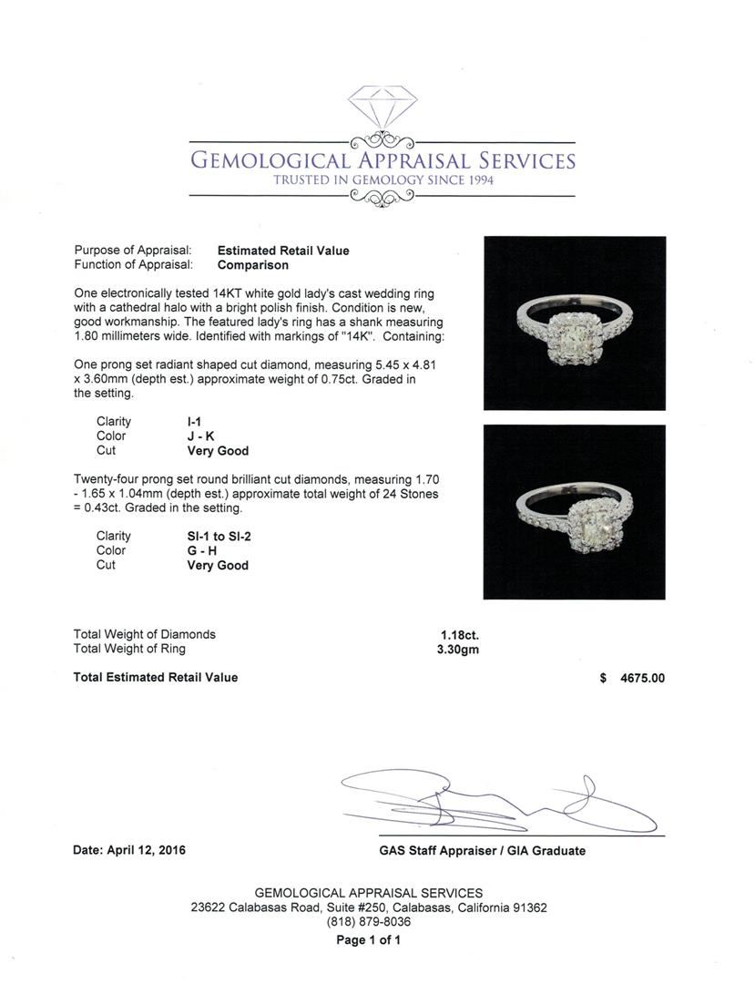 One electronically tested 14KT white gold lady's cast wedding ring with a cathedral halo with a bright polish finish. The featured lady's ring has a shank measuring 1.80 millimeters wide. Identified with markings of "14K". Condition is new, good workmanship. Containing: One prong set radiant shaped cut diamond, measuring 5.45 x 4.81 x 3.60mm (depth est.) approximate weight of 0.75ct. Graded in the setting. Clarity: I-1. Color: J - K. Cut Very Good Twenty-Four prong set round brilliant cut diamonds, measuring 1.70 - 1.65 x 1.04mm (depth est.) approximate total weight of 24 Stones = 0.43ct. Graded in the setting. Clarity: SI-1 to SI-2. Color: G - Very Good. Total Weight of Diamonds 1.18ct. Total Weight of Ring 3.30gm. GAS Appraised at $4,675.00.