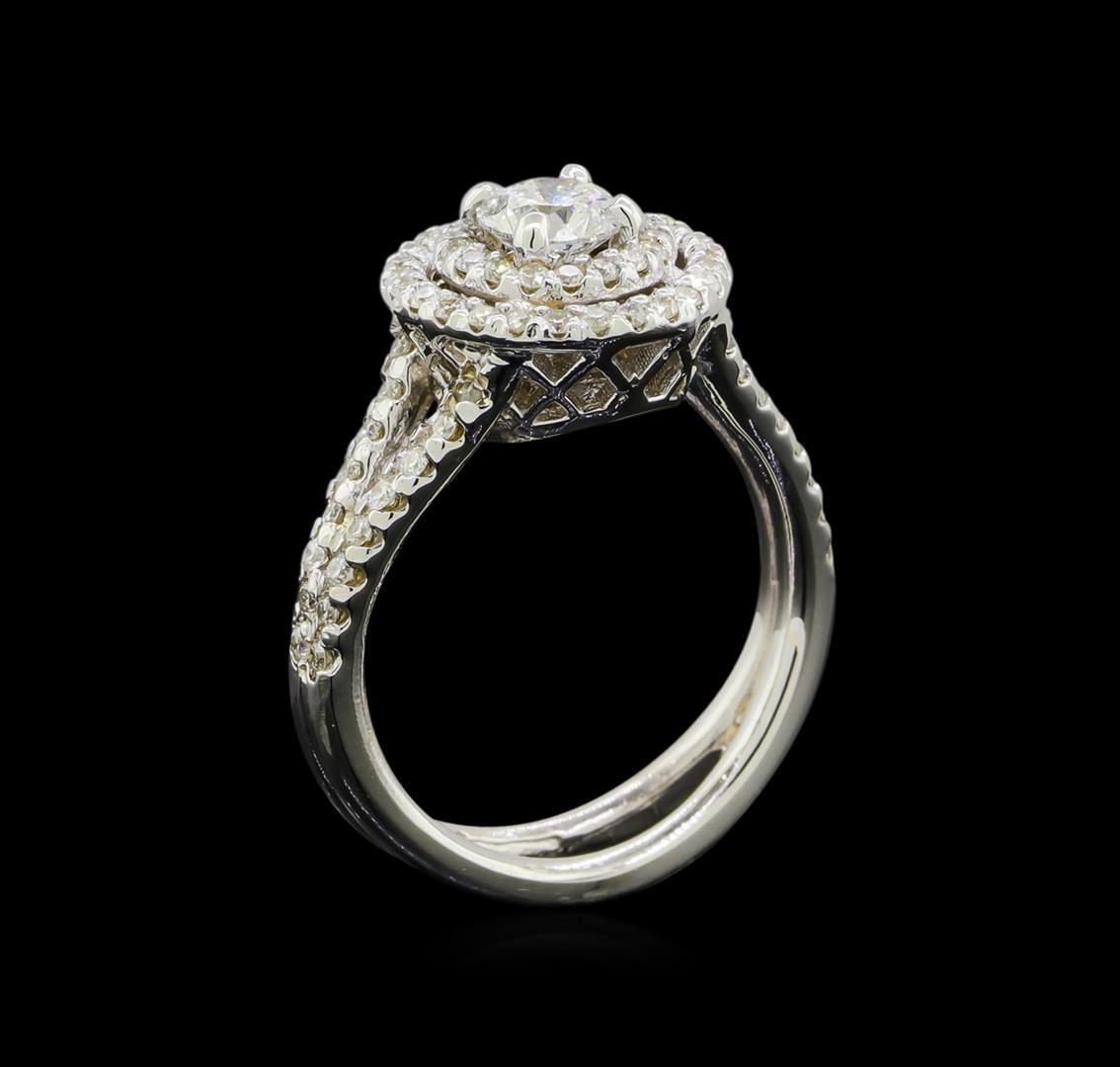 One electronically tested 14KT white gold lady's cast wedding ring with a split shank double basket halo with a bright polish finish. The featured lady's ring has a split double shank measuring 5.53 millimeters wide. Condition is new, good workmanship. Containing: One prong set round brilliant cut diamond, measuring 5.15 - 5.13 x 3.28mm (depth est.) , 10.00.%. GTCF approximate weight of 0.58ct. Graded in the setting. Clarity I-1. Color: H Cut Good Seventy-Six prong set round brilliant cut diamonds, measuring 1.30 - 1.25 x 0.79mm (depth est.) approximate total weight of 76 Stones = 0.60ct. Graded in the setting. Clarity SI-1 to SI-2. Color: H - I Cut Good. Total Weight of Diamonds 1.18ct.. Total Weight of Ring 6.30gm Liquidation Value $6110.00.. GAS Appraised at $5,465.00.