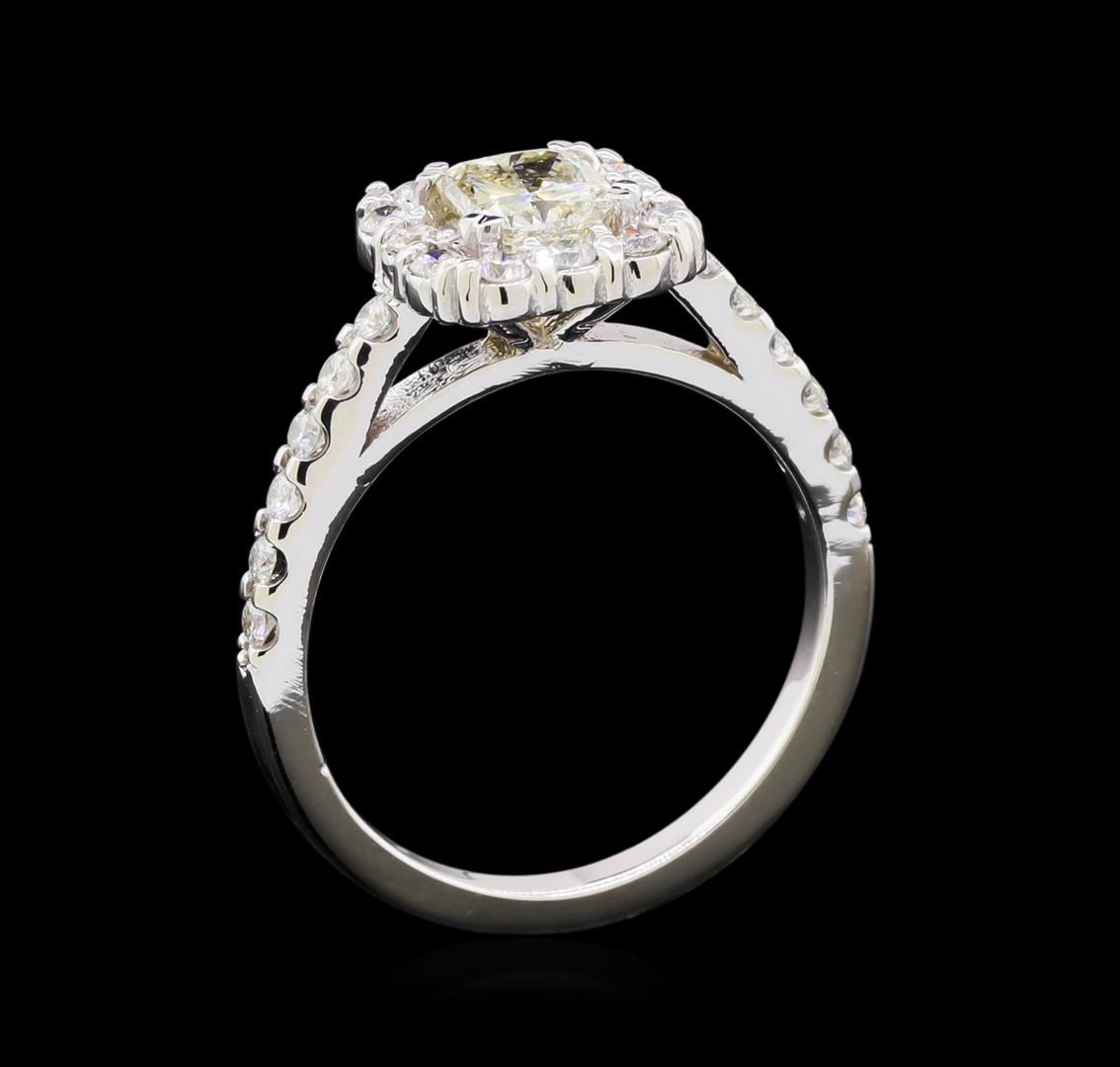 One electronically tested 14KT white gold lady's cast wedding ring with a cathedral halo with a bright polish finish. The featured lady's ring has a shank measuring 1.80 millimeters wide. Identified with markings of "14K". Condition is new, good workmanship. Containing: One prong set radiant shaped cut diamond, measuring 5.45 x 4.81 x 3.60mm (depth est.) approximate weight of 0.75ct. Graded in the setting. Clarity: I-1. Color: J - K. Cut Very Good Twenty-Four prong set round brilliant cut diamonds, measuring 1.70 - 1.65 x 1.04mm (depth est.) approximate total weight of 24 Stones = 0.43ct. Graded in the setting. Clarity: SI-1 to SI-2. Color: G - Very Good. Total Weight of Diamonds 1.18ct. Total Weight of Ring 3.30gm. GAS Appraised at $4,675.00.