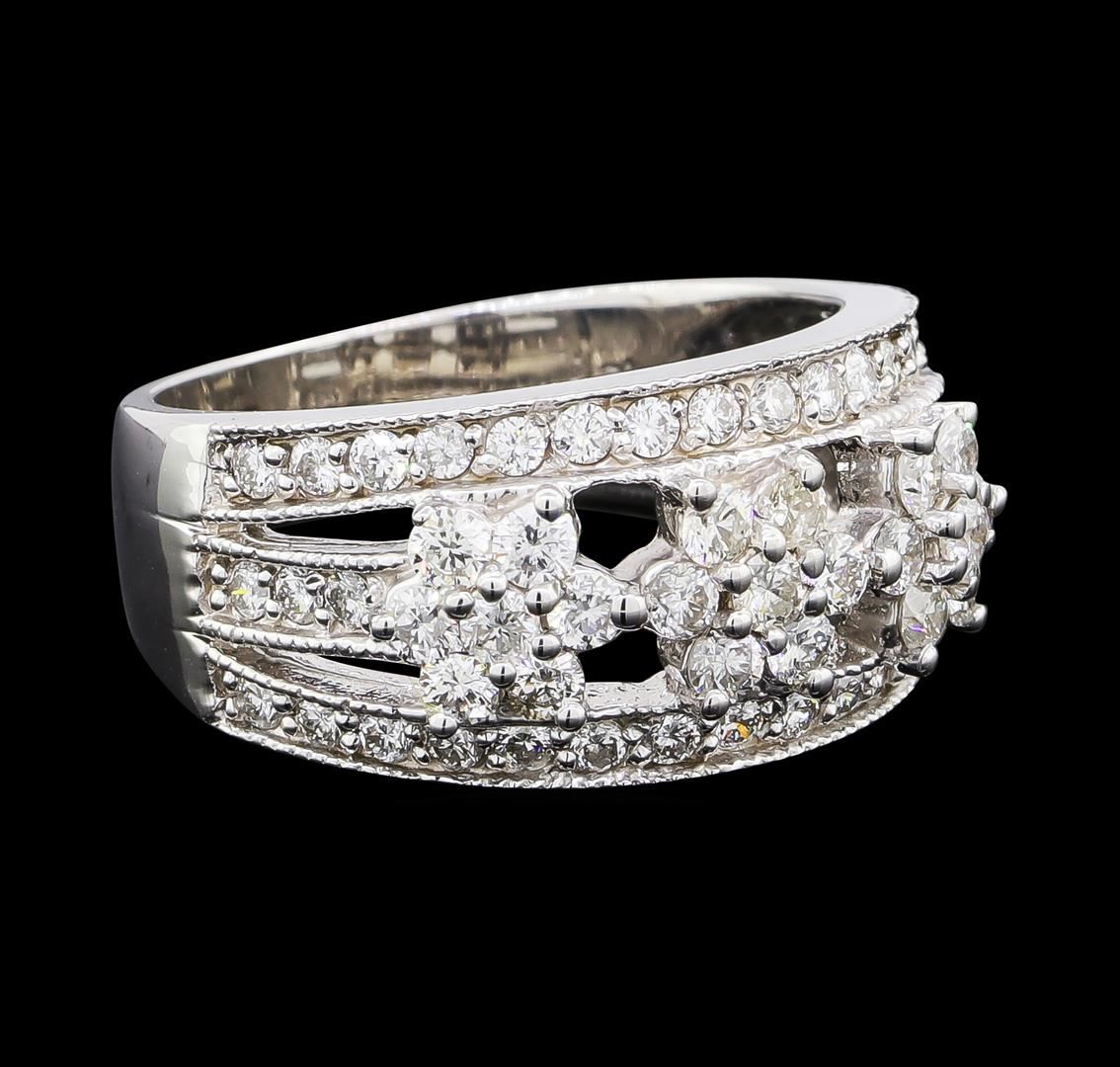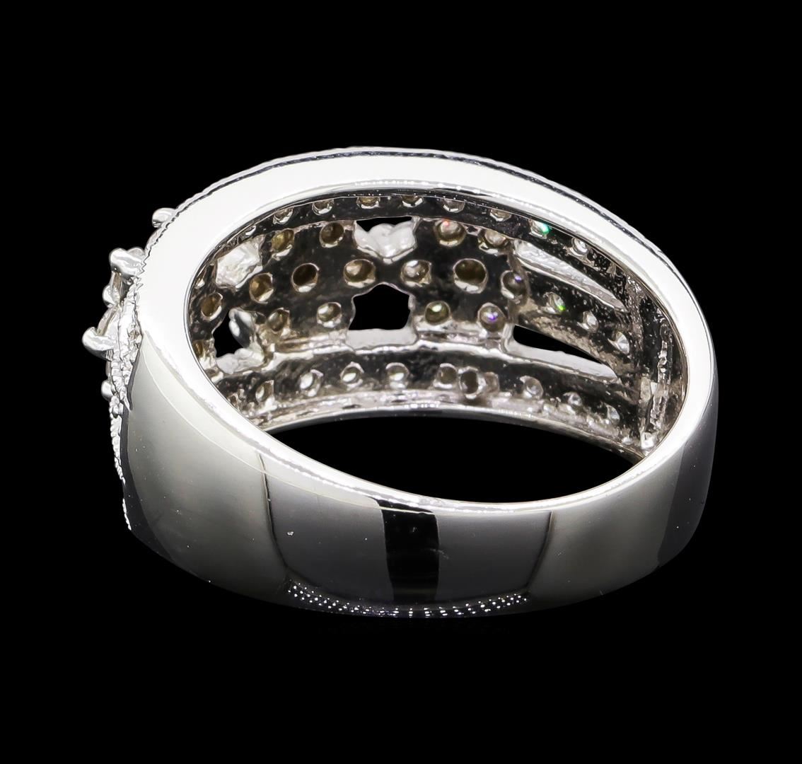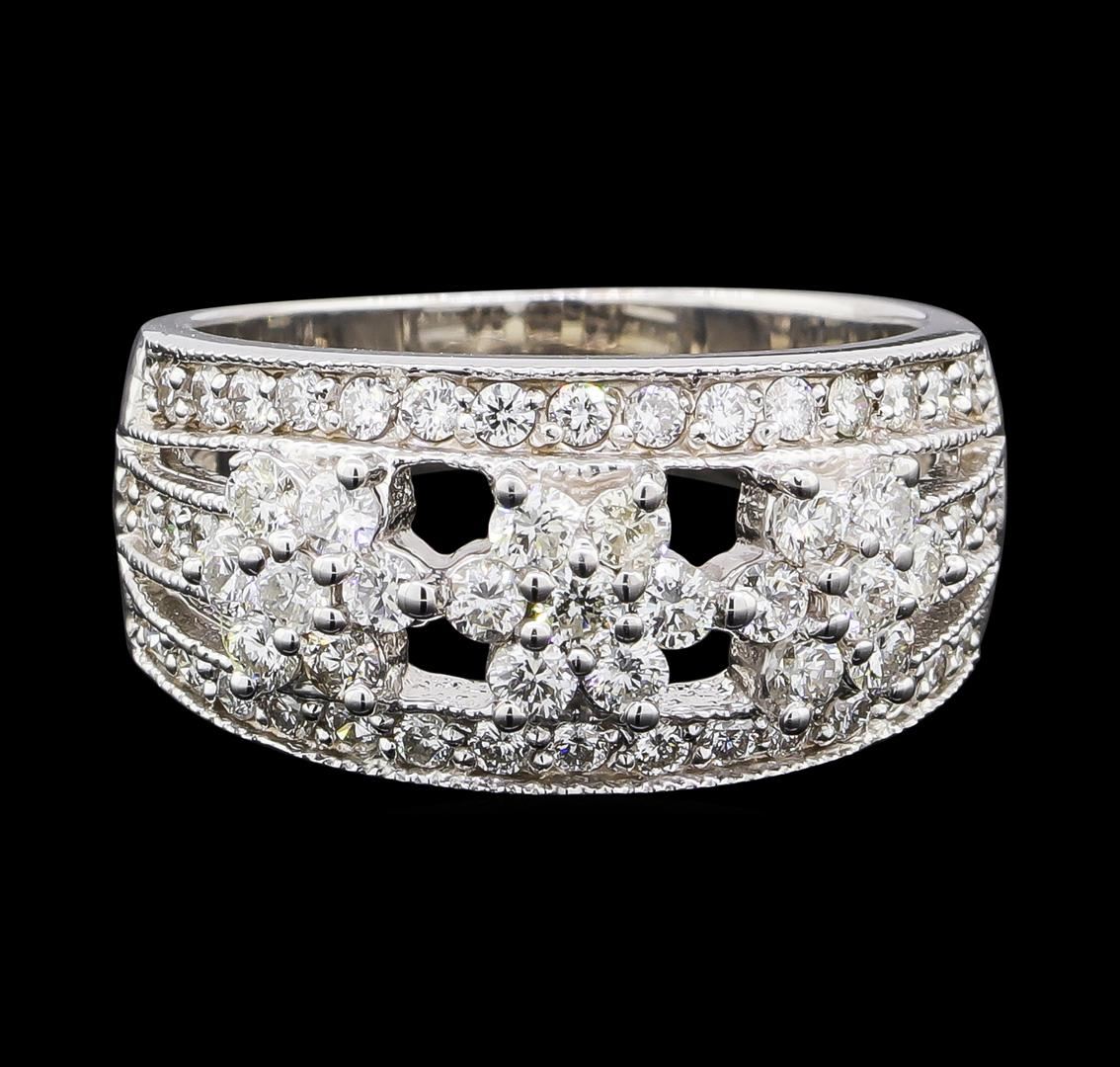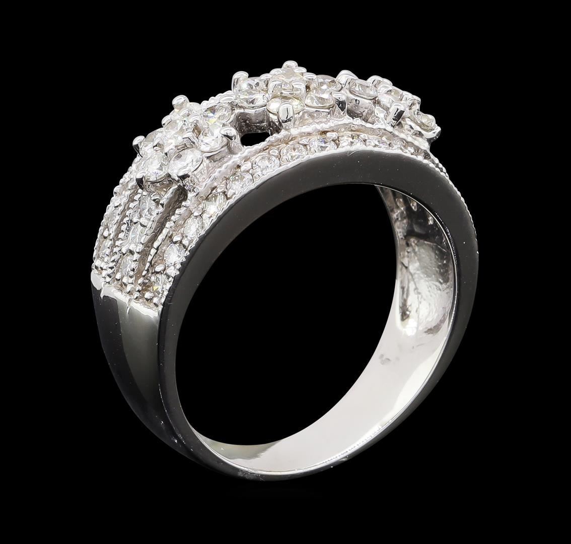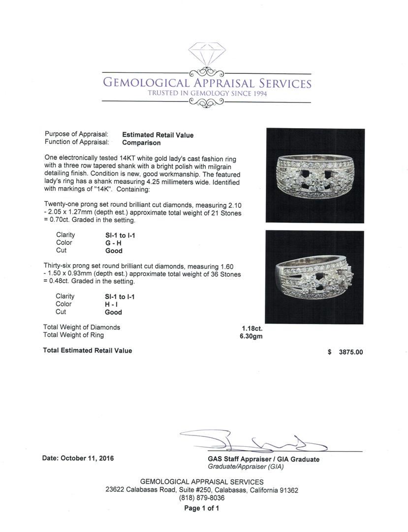 One electronically tested 14KT white gold lady's cast fashion ring with a three row tapered shank with a bright polish with milgrain detailing finish. The featured lady's ring has a shank measuring 4.25 millimeters wide. Identified with markings of '14K'. Condition is new, good workmanship. Containing: Twenty-One prong set round brilliant cut diamonds, measuring 2.10 - 2.05 x 1.27mm (depth est.) approximate total weight of 21 Stones = 0.70ct. Graded in the setting. Clarity SI-1 to I-1. Color: G - H Cut Good Thirty-Six prong set round brilliant cut diamonds, measuring 1.60 - 1.50 x 0.93mm (depth est.) approximate total weight of 36 Stones = 0.48ct. Graded in the setting. Clarity SI-1 to I-1. Color: H - I Cut Good. Total Weight of Diamonds 1.18ct.. Total Weight of Ring 6.30gm. GAS Appraised at $3,875.00.