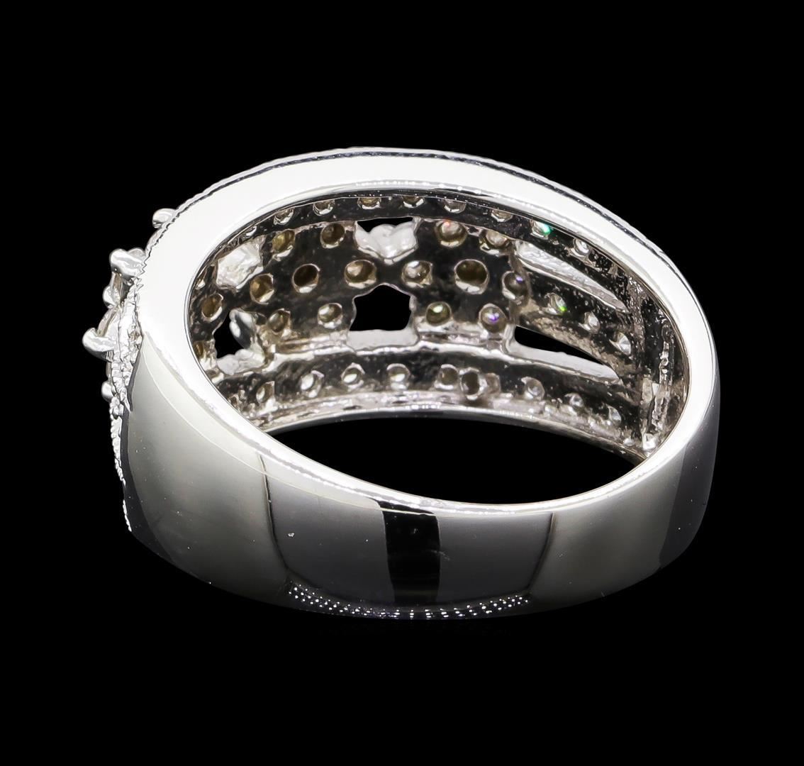One electronically tested 14KT white gold lady's cast fashion ring with a three row tapered shank with a bright polish with milgrain detailing finish. The featured lady's ring has a shank measuring 4.25 millimeters wide. Identified with markings of '14K'. Condition is new, good workmanship. Containing: Twenty-One prong set round brilliant cut diamonds, measuring 2.10 - 2.05 x 1.27mm (depth est.) approximate total weight of 21 Stones = 0.70ct. Graded in the setting. Clarity SI-1 to I-1. Color: G - H Cut Good Thirty-Six prong set round brilliant cut diamonds, measuring 1.60 - 1.50 x 0.93mm (depth est.) approximate total weight of 36 Stones = 0.48ct. Graded in the setting. Clarity SI-1 to I-1. Color: H - I Cut Good. Total Weight of Diamonds 1.18ct.. Total Weight of Ring 6.30gm. GAS Appraised.