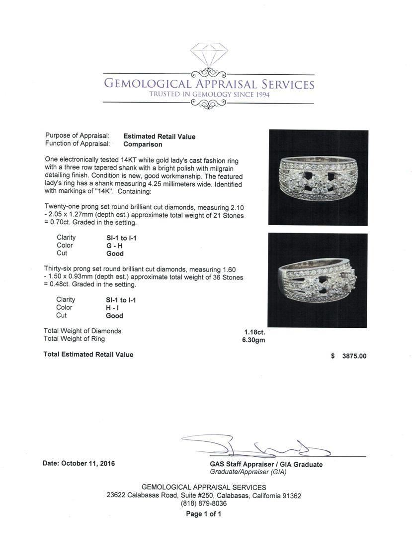 One electronically tested 14KT white gold lady's cast fashion ring with a three row tapered shank with a bright polish with milgrain detailing finish. The featured lady's ring has a shank measuring 4.25 millimeters wide. Identified with markings of '14K'. Condition is new, good workmanship. Containing: Twenty-One prong set round brilliant cut diamonds, measuring 2.10 - 2.05 x 1.27mm (depth est.) approximate total weight of 21 Stones = 0.70ct. Graded in the setting. Clarity SI-1 to I-1. Color: G - H Cut Good Thirty-Six prong set round brilliant cut diamonds, measuring 1.60 - 1.50 x 0.93mm (depth est.) approximate total weight of 36 Stones = 0.48ct. Graded in the setting. Clarity SI-1 to I-1. Color: H - I Cut Good. Total Weight of Diamonds 1.18ct.. Total Weight of Ring 6.30gm. GAS Appraised.