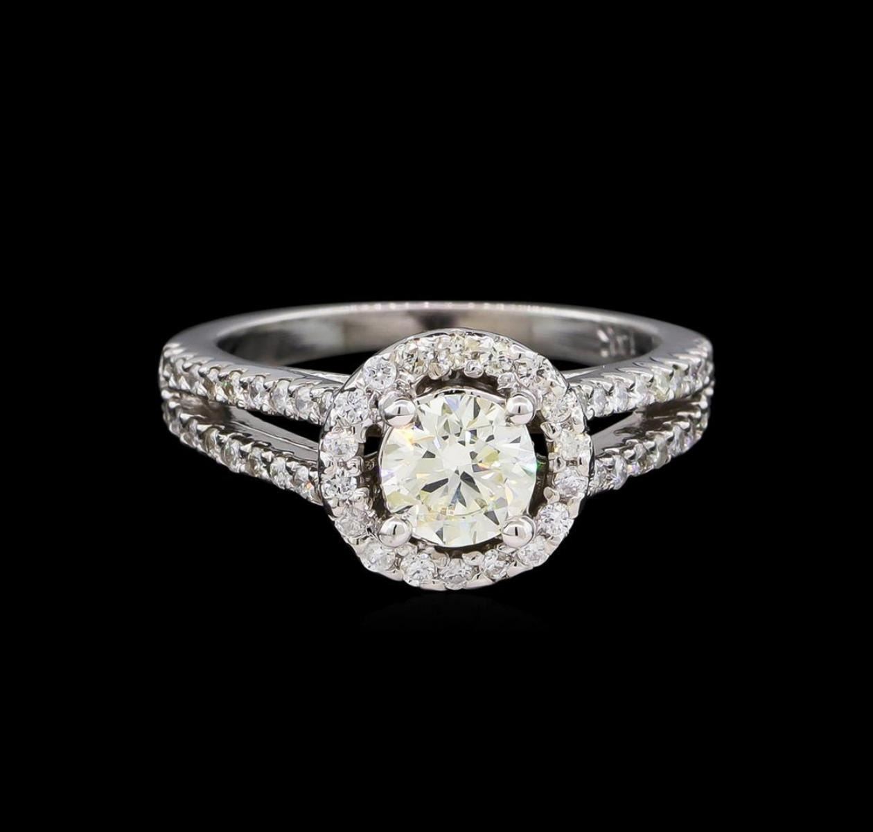 One electronically tested 14KT white gold lady's cast wedding ring with a split shank basket halo with a bright polish finish. The featured lady's ring has a shank measuring 1.86 millimeters wide. Identified with markings of "14K". Condition is new, good workmanship. Containing: One prong set round brilliant cut diamond, measuring 5.71 - 5.69 x 3.53mm (depth est.) approximate weight of 0.70ct. Graded in the setting. Clarity: SI-1. Color: Ideal Fifty-Eight prong set round brilliant cut diamonds, measuring 1.35 - 1.25 x 0.81mm (depth est.) approximate total weight of 58 Stones = 0.48ct. Graded in the setting. Clarity: SI-1 to I-1. Color: G - I. Cut Good. Total Weight of Diamonds 1.18ct. Total Weight of Ring 5.20gm GAS Appraised.