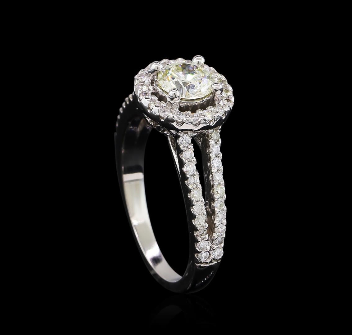 One electronically tested 14KT white gold lady's cast wedding ring with a split shank basket halo with a bright polish finish. The featured lady's ring has a shank measuring 1.86 millimeters wide. Identified with markings of "14K". Condition is new, good workmanship. Containing: One prong set round brilliant cut diamond, measuring 5.71 - 5.69 x 3.53mm (depth est.) approximate weight of 0.70 ct. Graded in the setting. Clarity: SI-1. Color: Ideal Fifty-Eight prong set round brilliant cut diamonds, measuring 1.35 - 1.25 x 0.81mm (depth est.) approximate total weight of 58 Stones = 0.48ct. Graded in the setting. Clarity: SI-1 to I-1. Color: G - I. Cut Good. Total Weight of Diamonds 1.18ct. Total Weight of Ring 5.20gm GAS Appraised.