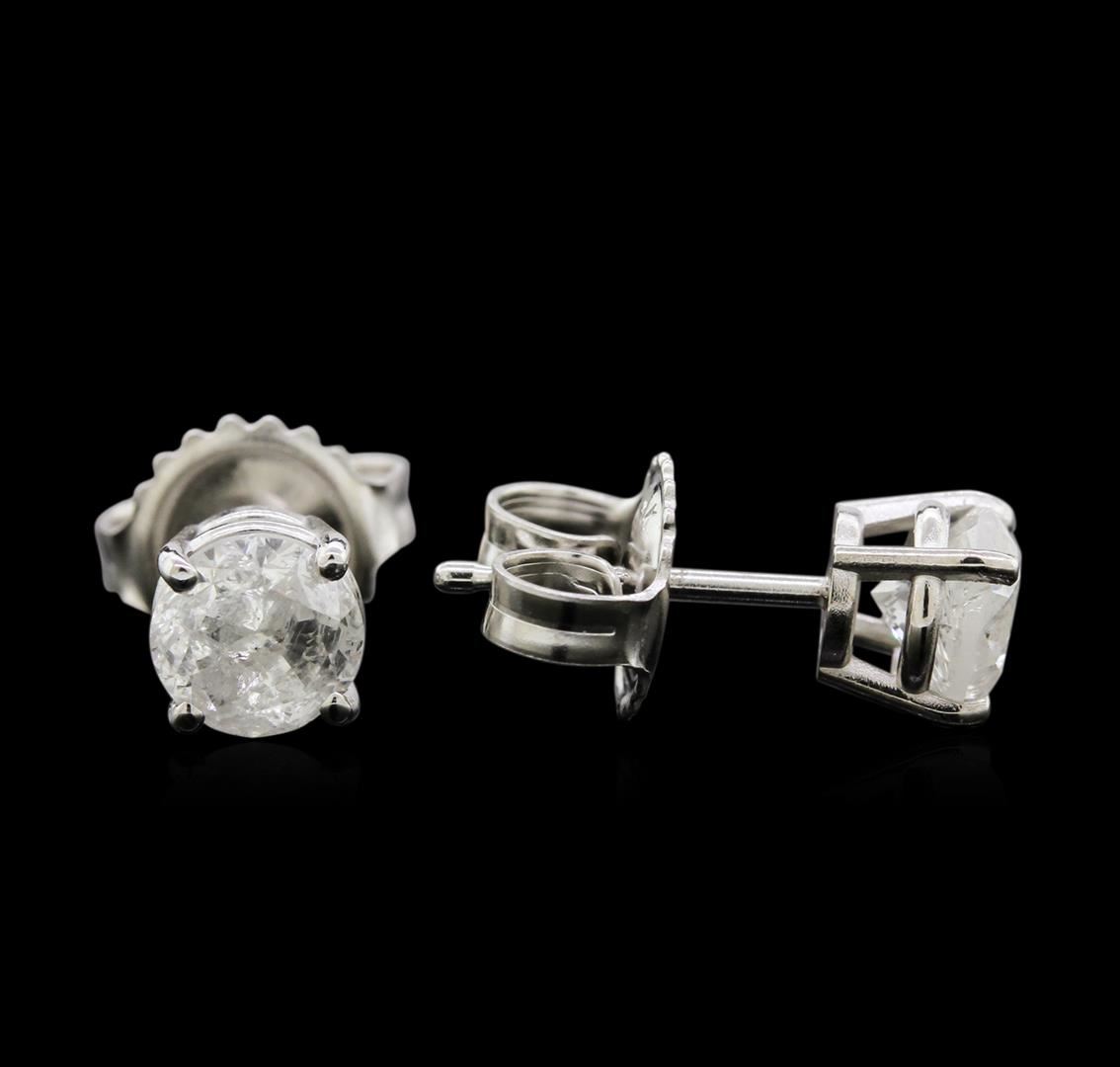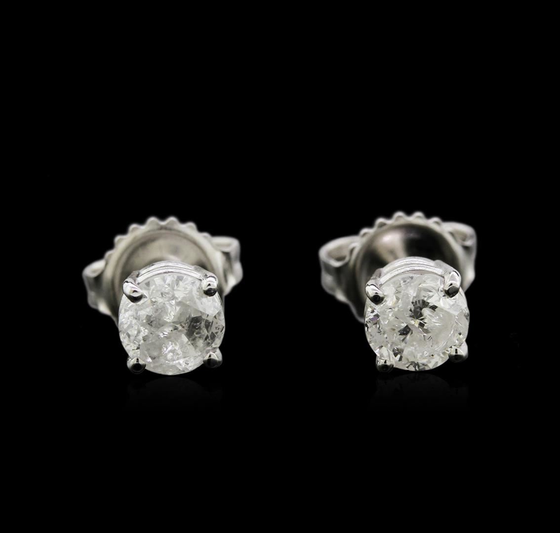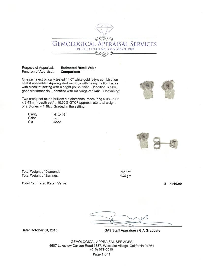 One pair electronically tested 14KT white gold lady's combination cast & assembled 4-prong stud earrings with heavy friction backs with a basket setting with a bright polish finish. Identified with markings of "14K". Condition is new, good workmanship. Containing: Two prong set round brilliant cut diamonds, measuring 5.08 - 5.02 x 3.43mm (depth est.) , 10.00% GTCF approximate total weight of 2 Stones = 1.18ct. Graded in the setting. Clarity: I-2 to I-3. Color: I - Good. Total Weight of Diamonds 1.18ct. Total Weight of Earrings 1.30gm. GAS Appraised.