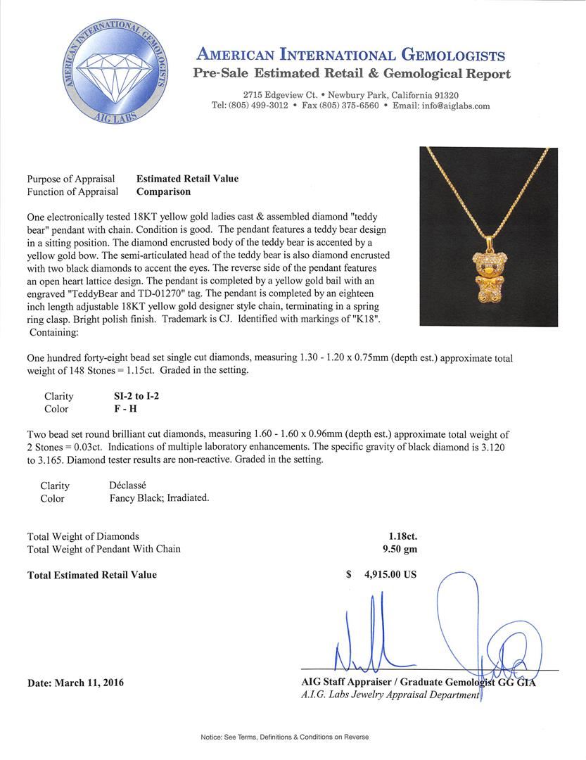 One electronically tested 18KT yellow gold ladies cast & assembled diamond teddy bear pendant with chain. Condition is good. The pendant features a teddy bear design in a sitting position. The diamond encrusted body of the teddy bear is accented by a yellow gold bow. The semi-articulated head of the teddy bear is also diamond encrusted with two black diamonds to accent the eyes. The reverse side of the pendant features an open heart lattice design. The pendant is completed by a yellow gold bail with an engraved Teddy Bear and TD-01270 tag. The pendant is completed by an eighteen inch length adjustable 18KT yellow gold designer style chain, terminating in a spring ring clasp. Bright polish finish. Trademark us CJ. Identified with markings of K18. Containing: One hundred forty-eight bead set single cut diamonds, measuring 1.30 - 1.20 x 0.75mm (depth est.) approximate total weight of 148 Stones = 1.15ct. Graded in the setting. Clarity: SI-2 to I-2. Color: F - H. Two bead set round brilliant cut diamonds, measuring 1.60 - 1.60 x 0.96mm (depth est.) approximate total weight of 2 Stones = 0.03ct. Indications of multiple laboratory enhancements. The specific gravity of black diamond is 3.120 to 3.165. Diamond tester results are non-reactive. Graded in the setting. Clarity: Declasse. Color: Fancy black; irradiated. Total Weight of Diamonds 1.18ct. Total Weight of Pendant With Chain 9.50 grams. AIG Appraised at $4,915.00.